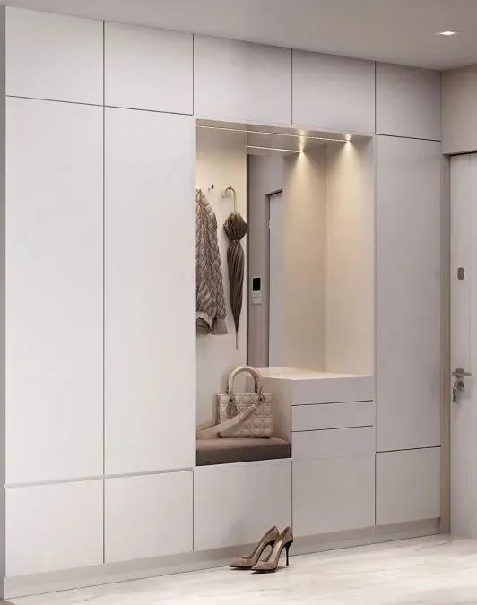 玄關處設計師打造了一整座的入門衣柜,內嵌的發(fā)光璧龕可做日常的換鞋凳使用。