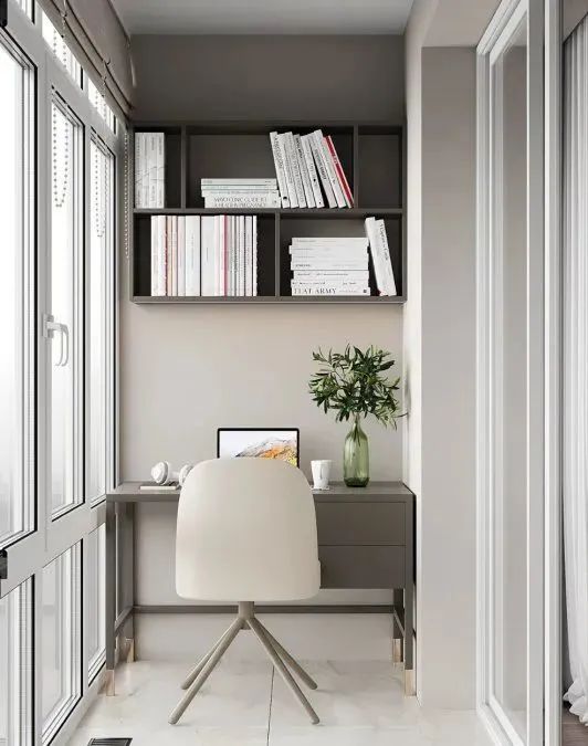 陽臺被設計成內包式,設計師將它們整體規(guī)劃成辦公區(qū)域和休息空間,羅馬百葉窗的設計讓陽光盡情地涌入室內。