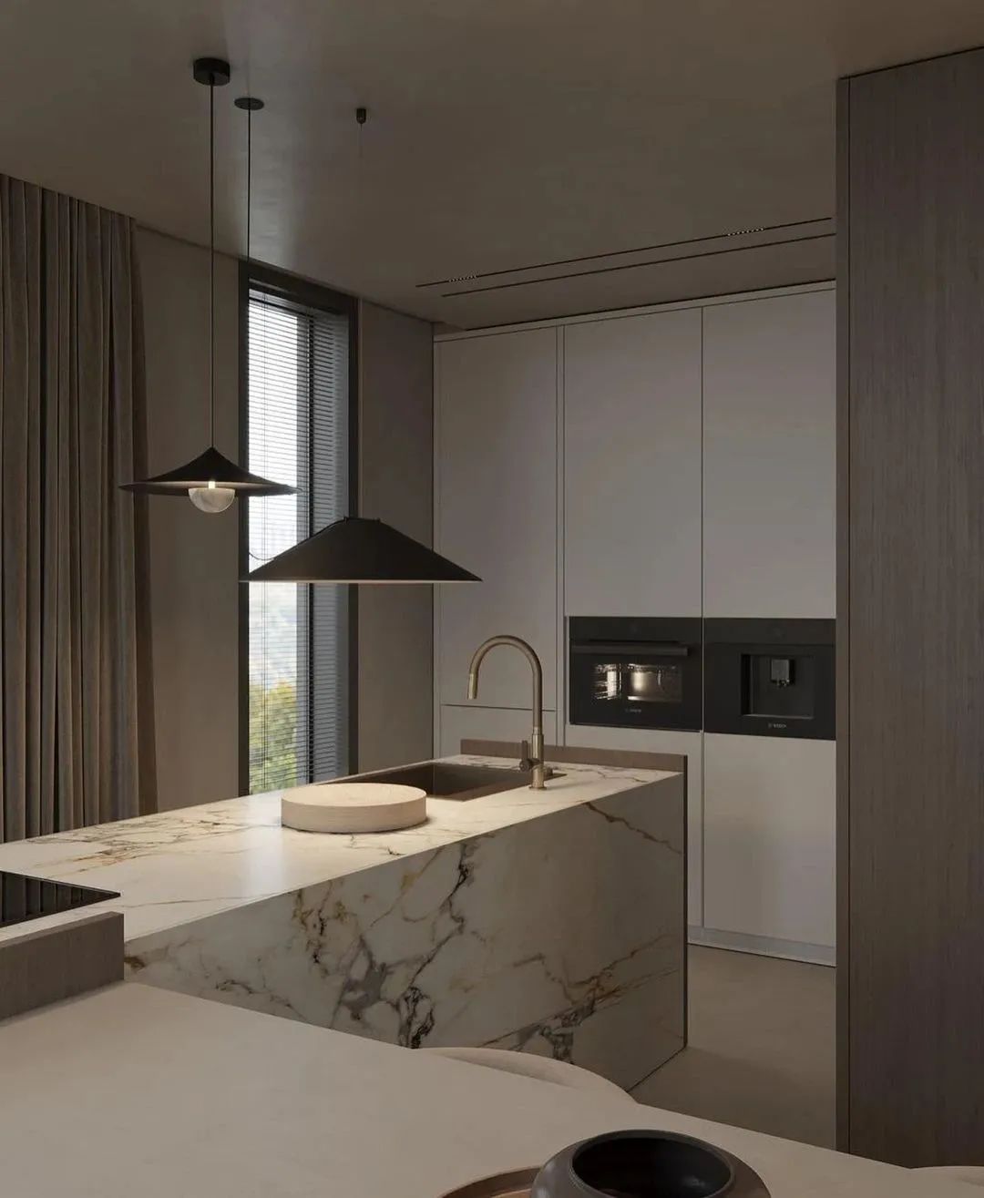 設計師選用極簡主義風格塑造空間,利用原木大理石等天然材料,豐富空間的細節,提升整體的質感。簡潔的形式包含復雜的系統,營造出輕盈的空間氛圍。
