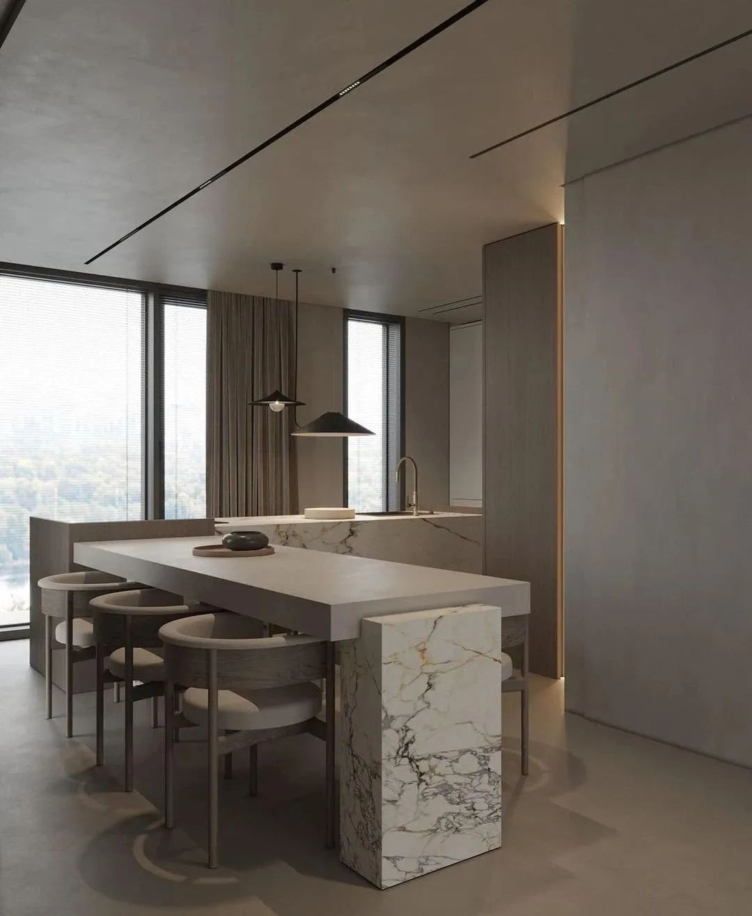 餐廳和廚房位于同一空間。白色大理石材質的中島臺與餐桌相連接,簡潔的造型為屋主營造出了一個高級大氣的用餐空間。落地窗的存在讓屋主在用餐時還能欣賞到窗外的風景,廚房電器鑲嵌與櫥柜之中,兼具美觀性與實用性。