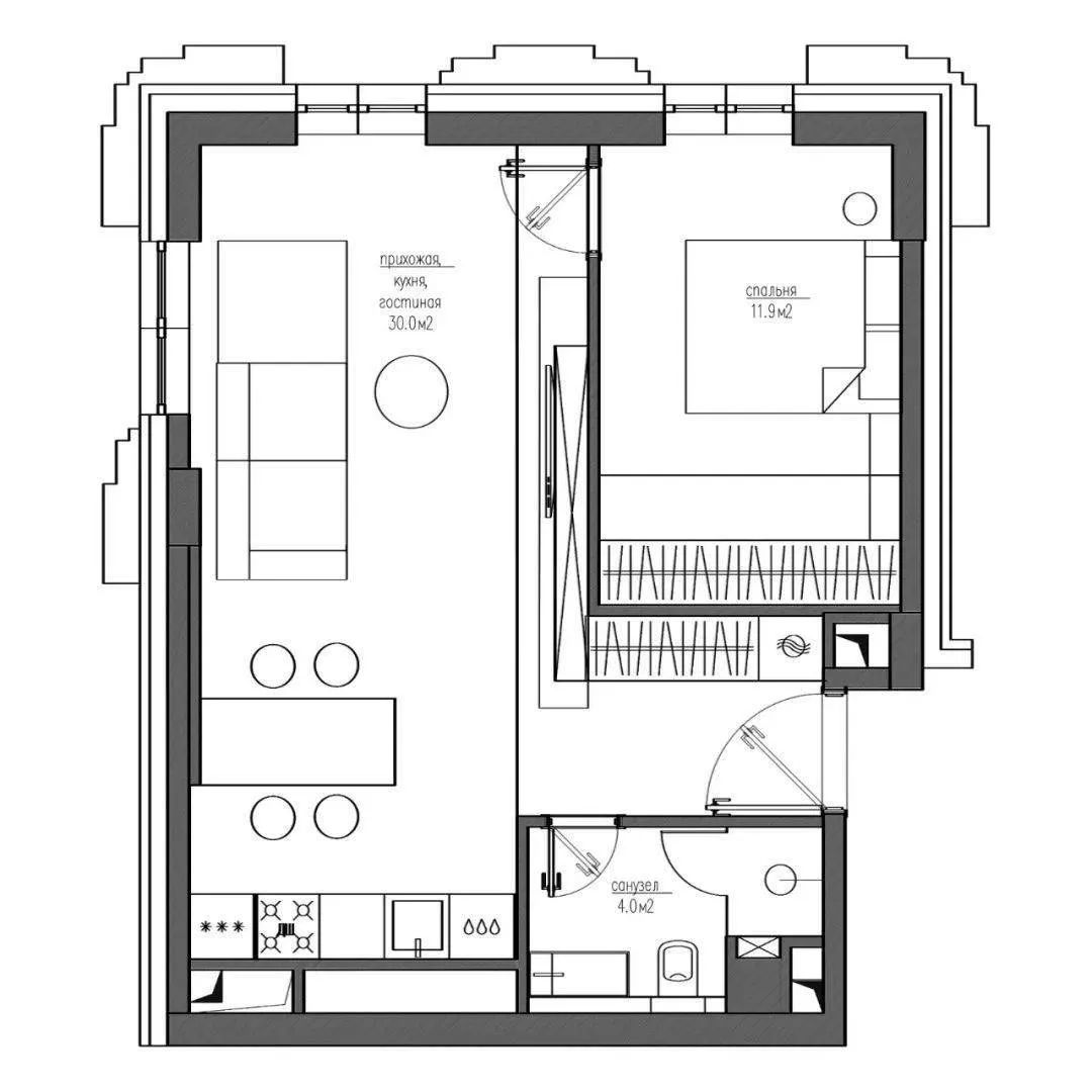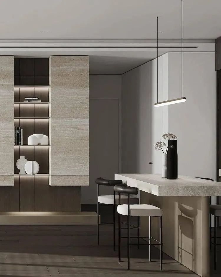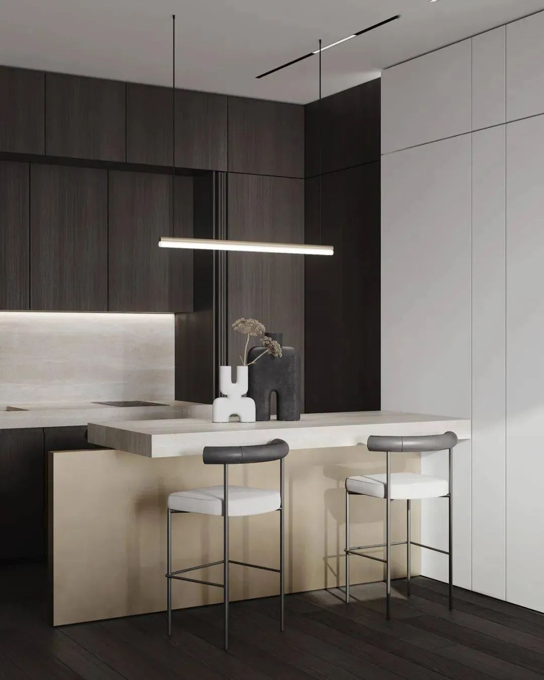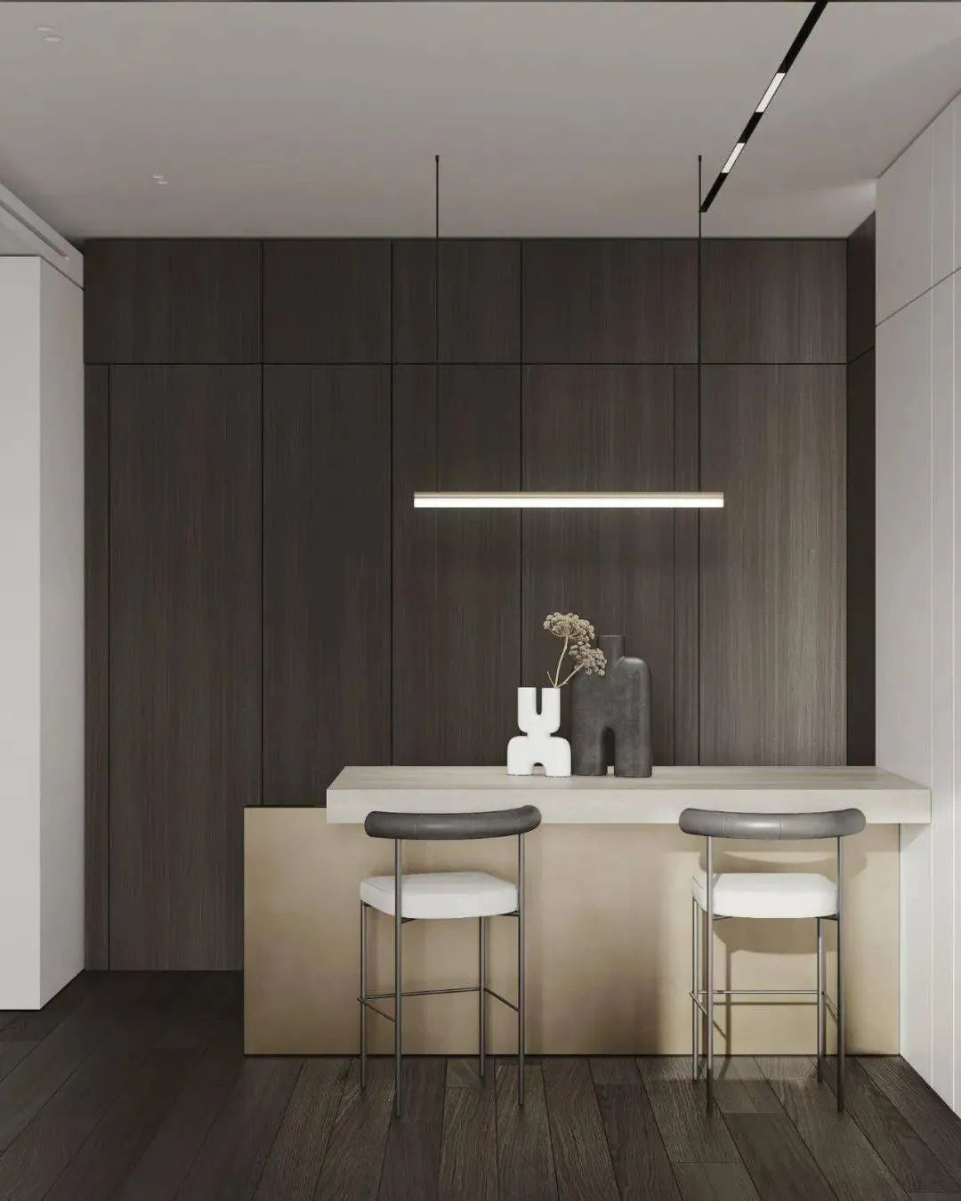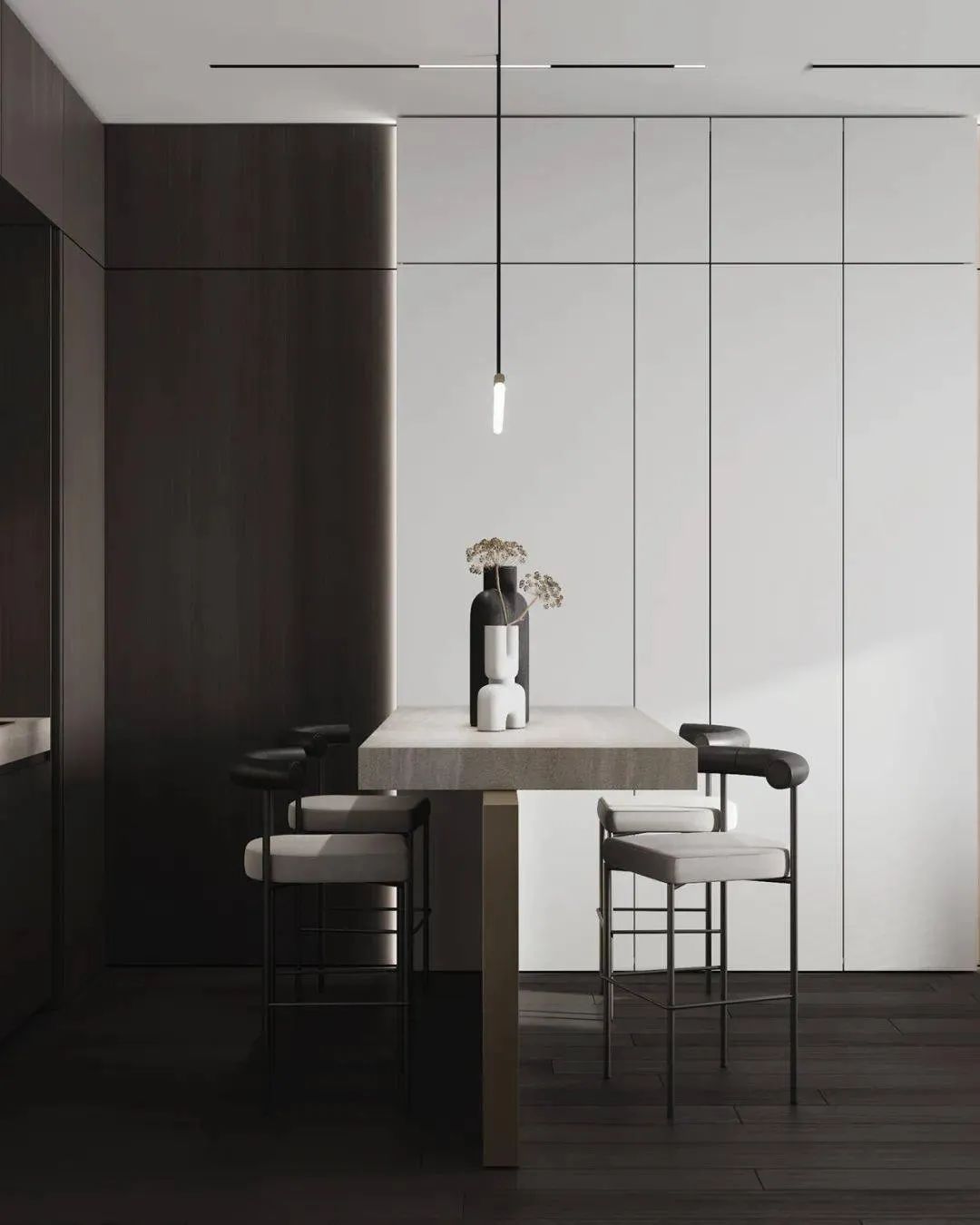 考慮到這個公寓的面積有限,設(shè)計師用到了緊鄰廚房的兩座吧臺餐桌,在有限的范圍內(nèi)做出了舒適的廚房空間和就餐空間,餐桌也起到了一個隔斷的作用,將廚房空間和客廳分割,金屬和實木結(jié)合的餐桌椅有很強的肌理感。