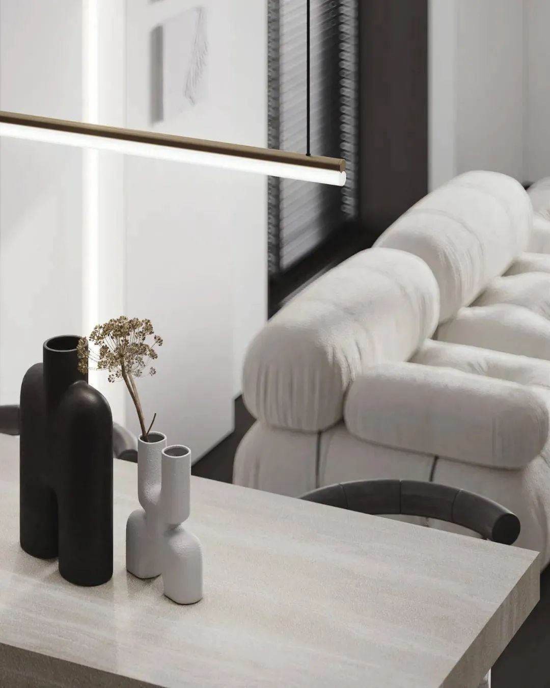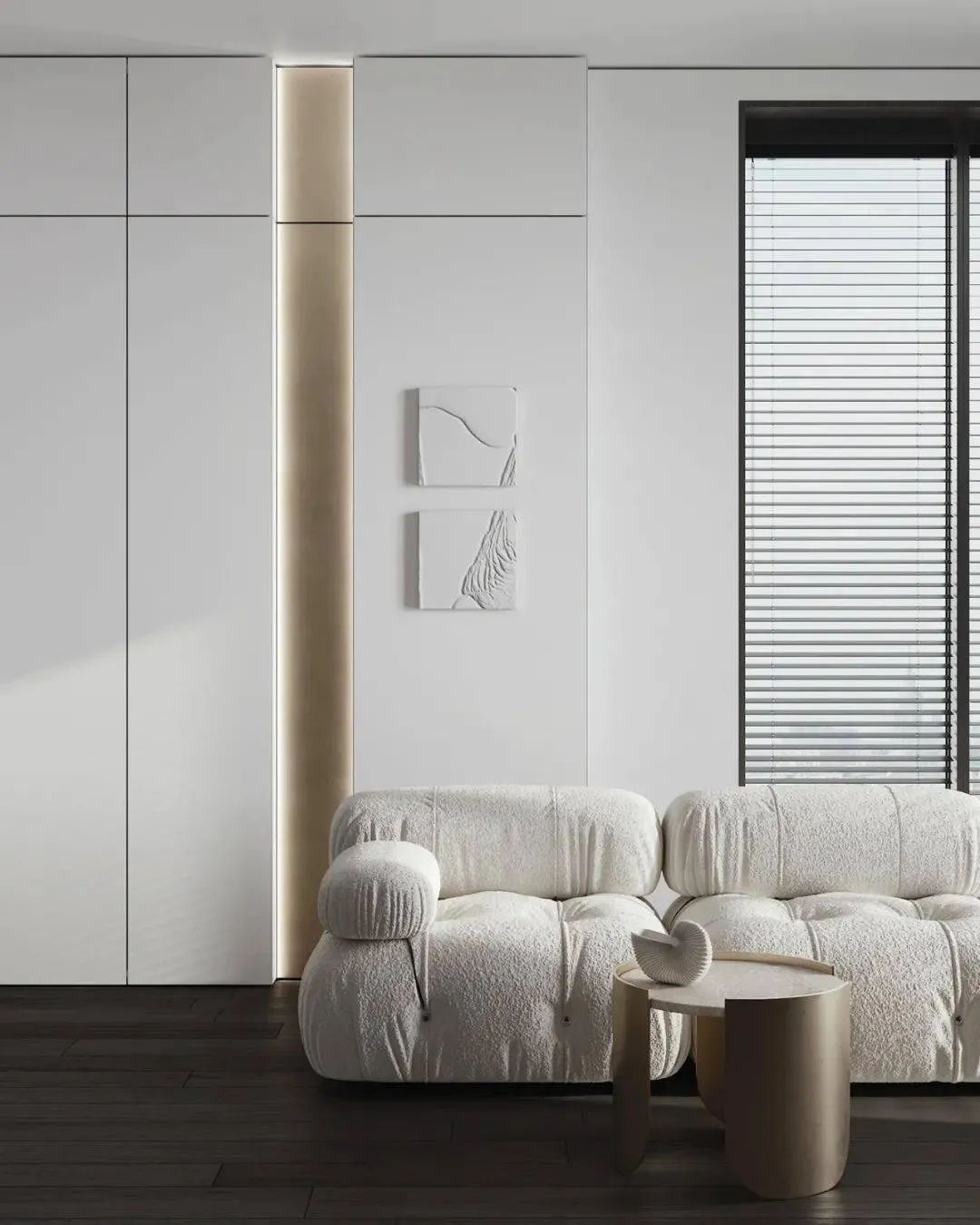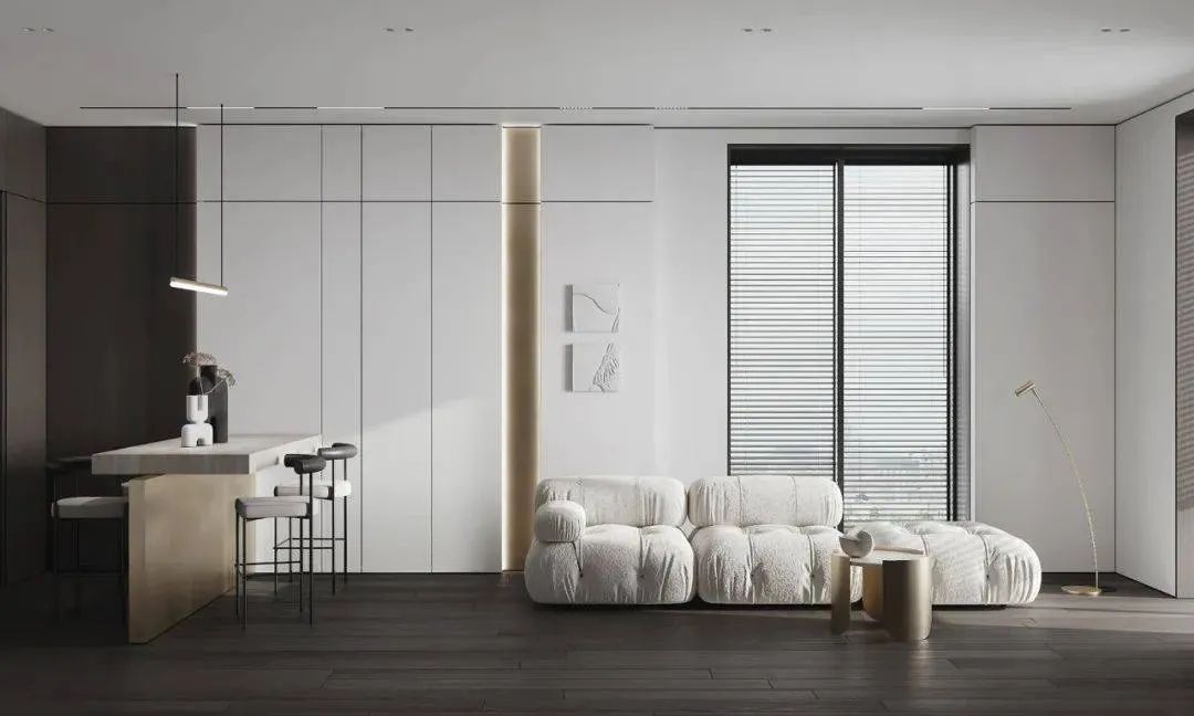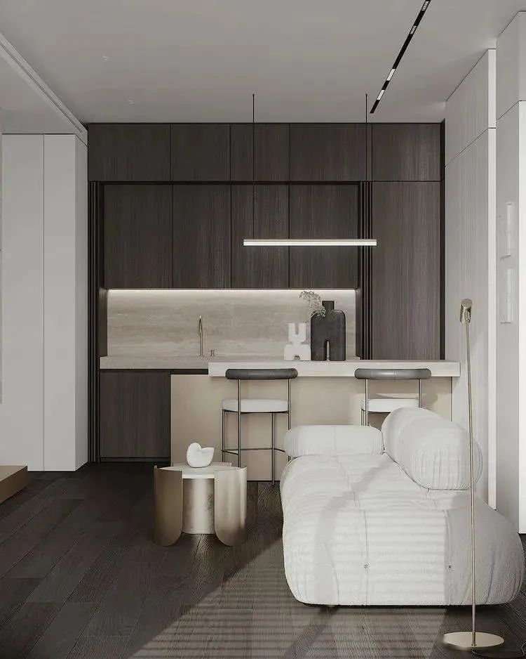 空間以白色調(diào)為主,通過用多種輕奢感十足的元素來對空間進行裝飾,家具擺放簡潔質(zhì)樸,空間整體呈現(xiàn)出的氛圍感強烈,這個狹小的空間在設(shè)計師的打造下成為了一個寧靜的私人小天地。