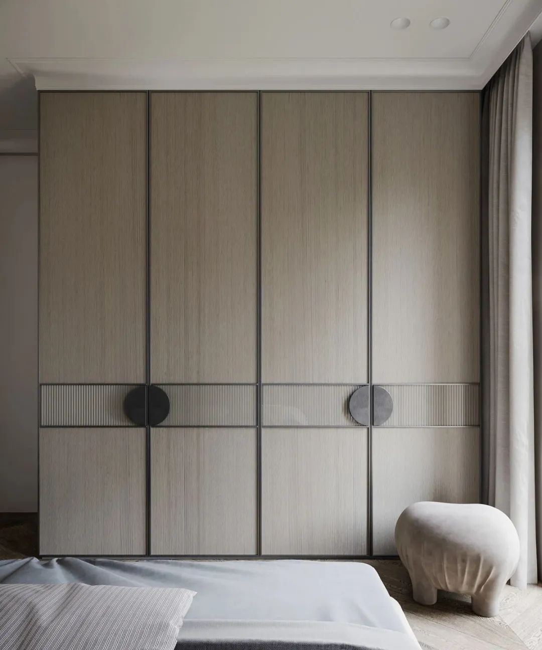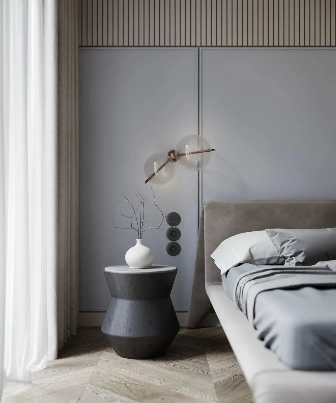 臥室以米色調為主,佐以淡灰色的軟飾,吊燈融入了禪意的元素,讓人心情寧靜,一股平和心情油然而生。 【】