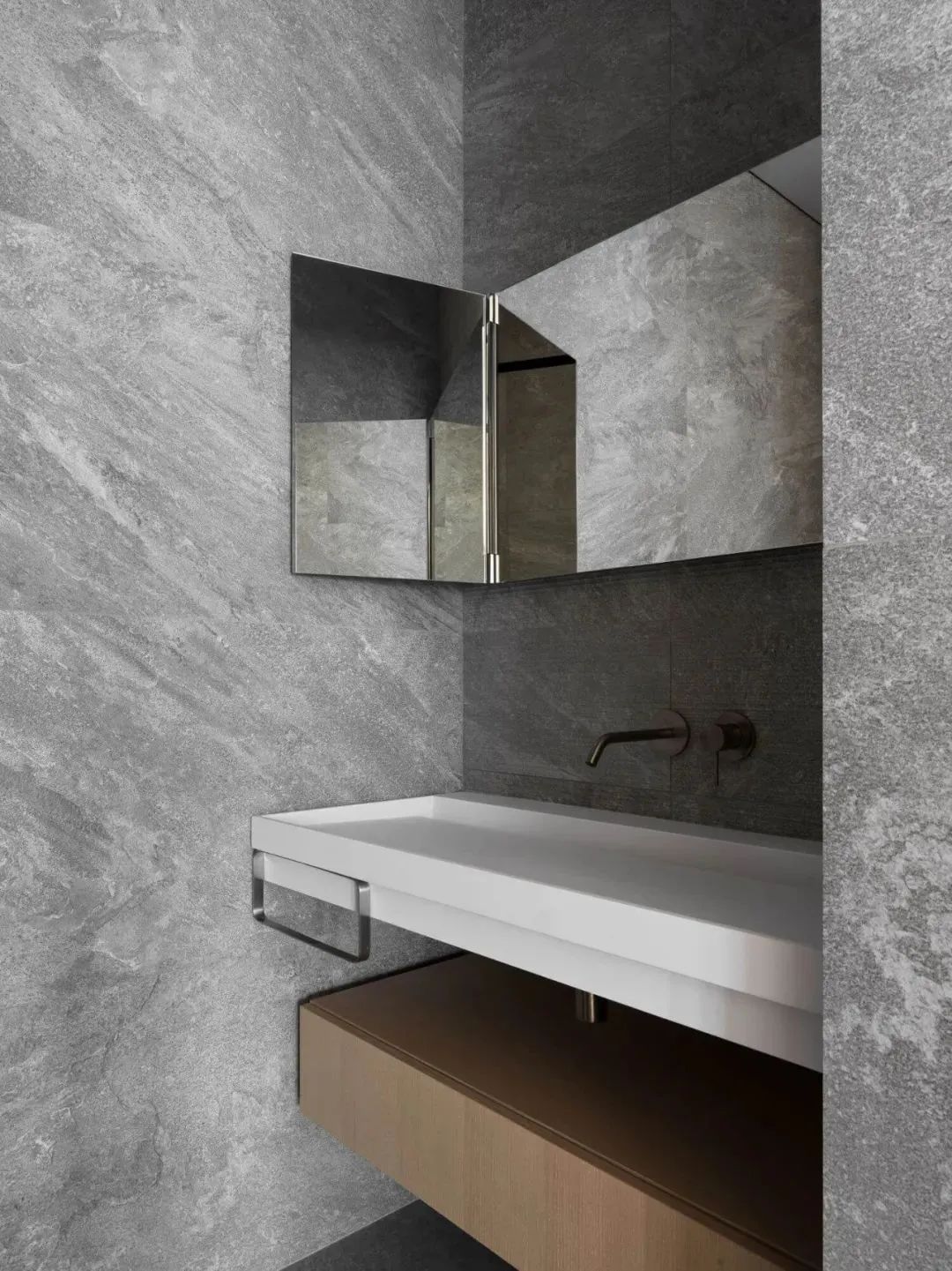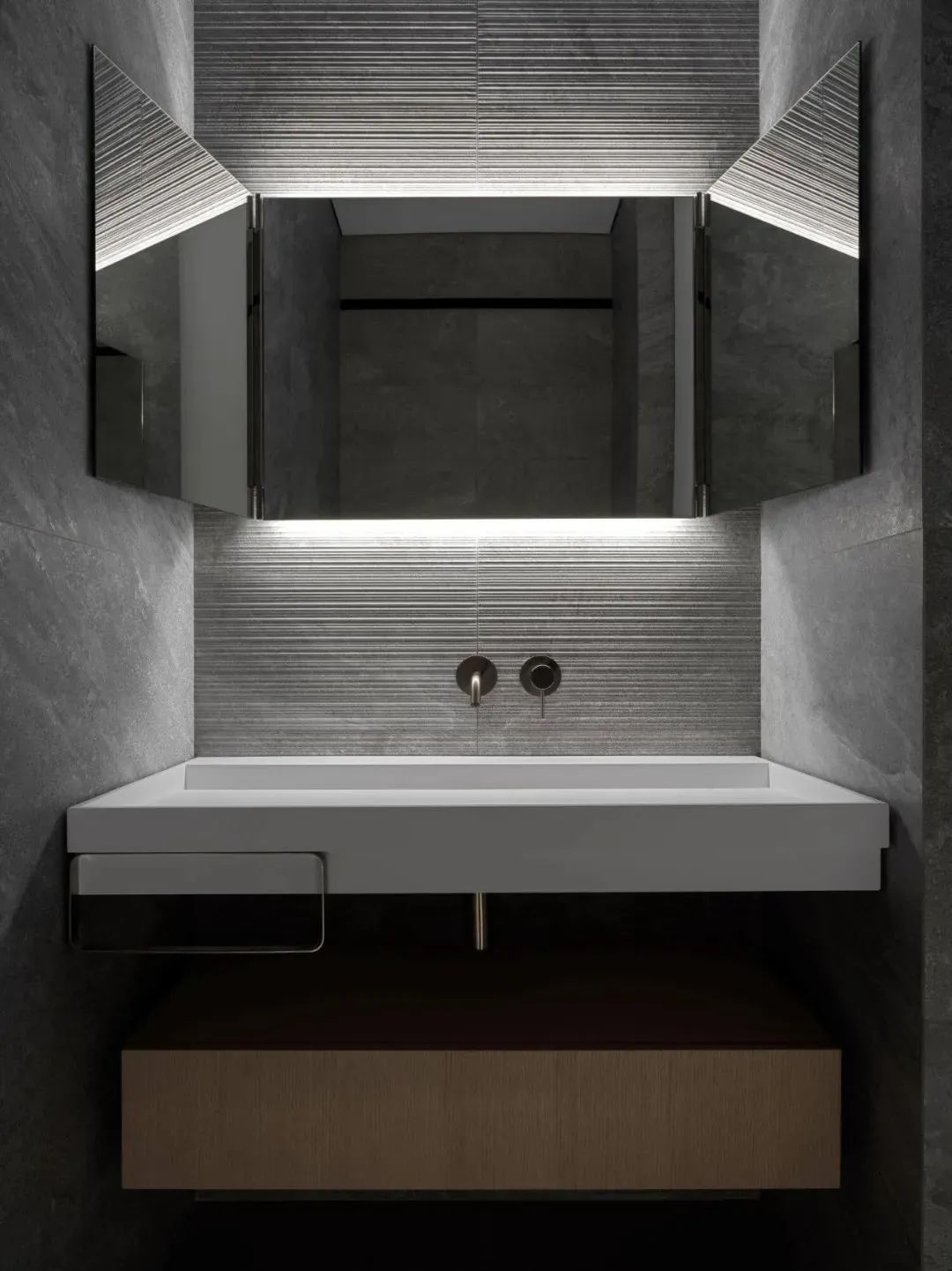 衛(wèi)生間的內(nèi)飾設(shè)計十分精致,灰色調(diào)的空間在燈光的襯托下,顯得十分有個性,體現(xiàn)出了主人的生活文化品味。