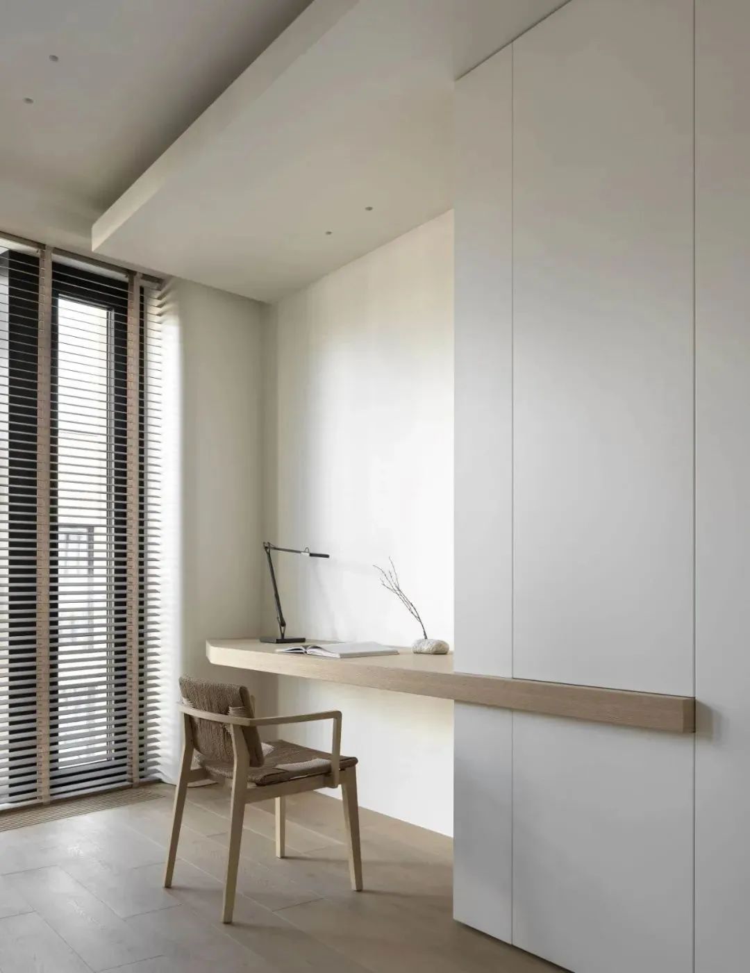 臥室延續(xù)了流暢的線條和漂浮的主題,懸空的床體十分吸睛,給人們帶來新奇的視覺體驗。床頭柜與床相連接,更具一體性。一旁的木質(zhì)書桌與櫥柜相連接,為屋主提供了一個能夠?qū)P墓ぷ鞯目臻g。一旁的落地窗,也能讓屋主欣賞到窗外的美景,十分輕松愜意。
