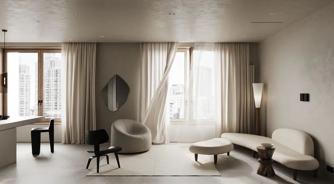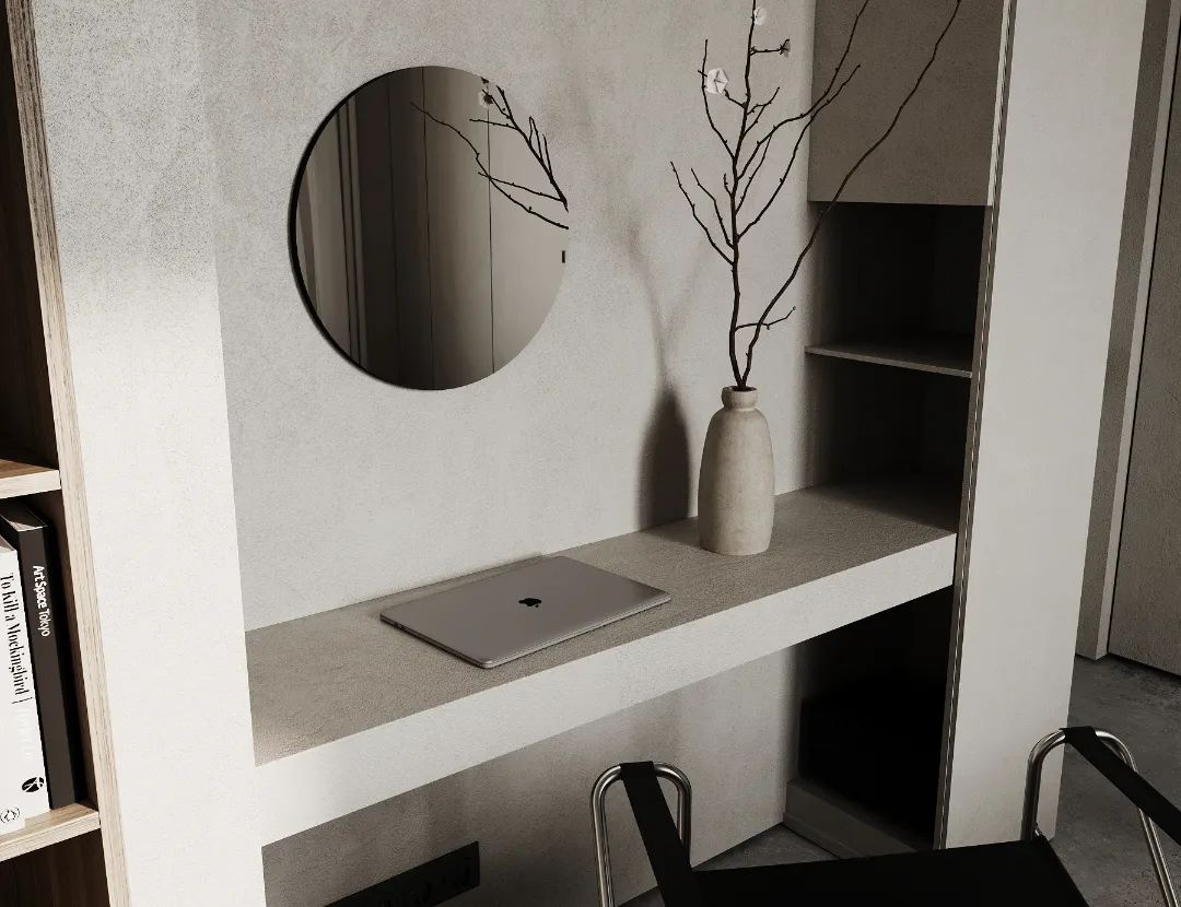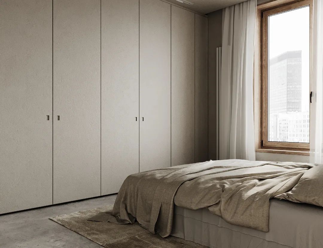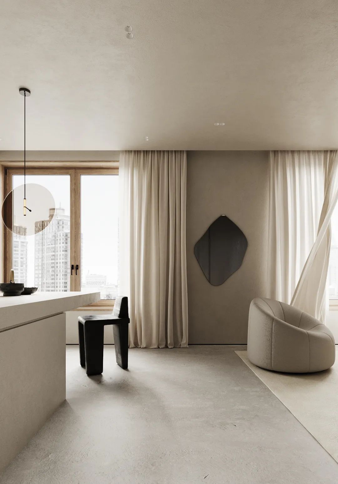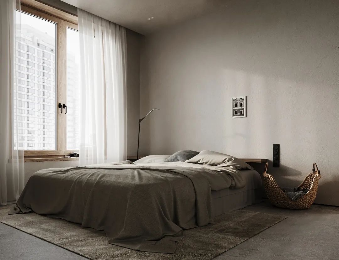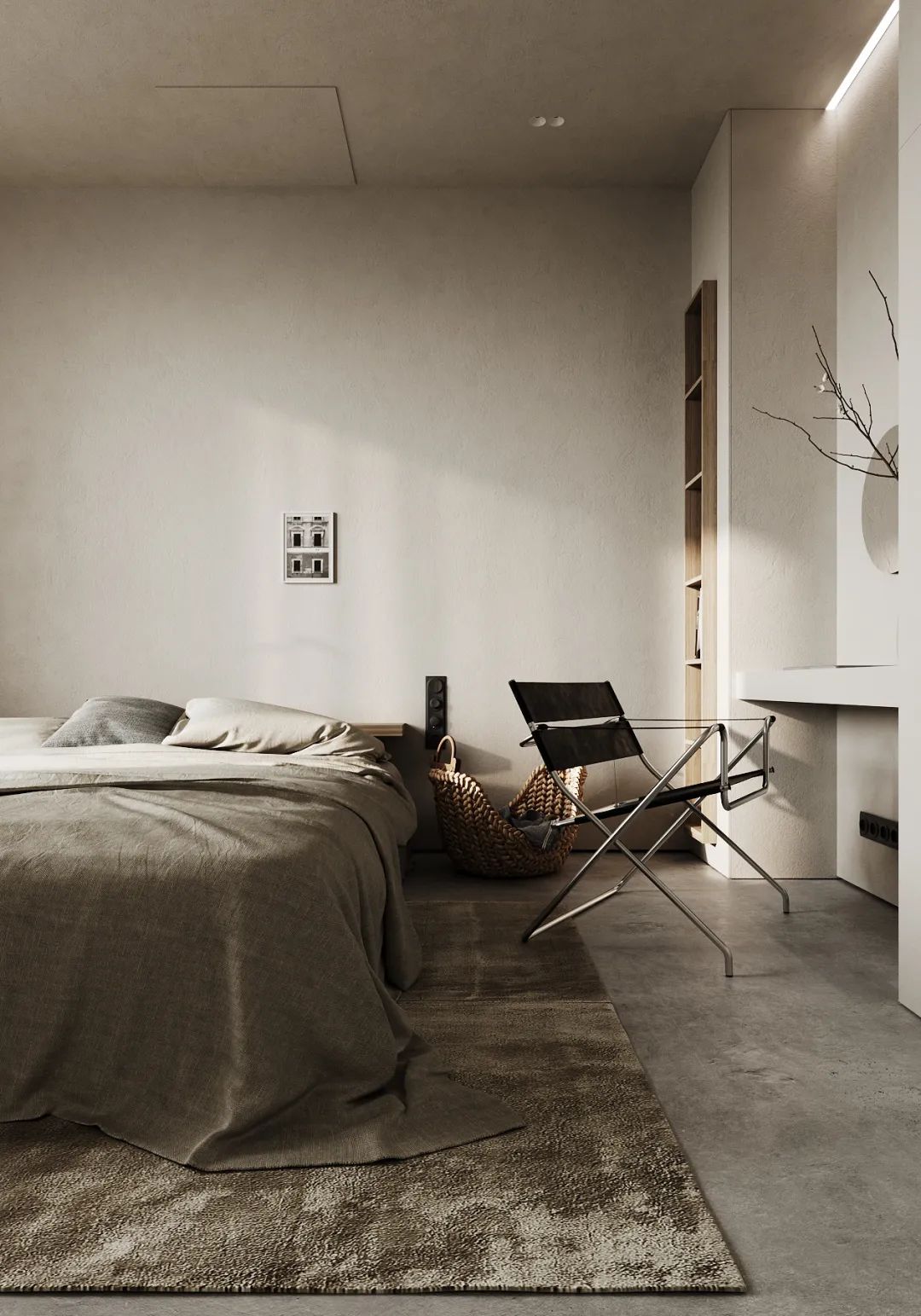 臥室運用極簡主義的設計手法,利用微水泥創(chuàng)造了一個充滿藝術格調(diào)的空間,材質(zhì)和色彩均與空間整體相呼應,從配飾的細節(jié)上來看,設計師更偏于古典和獨特的風格。