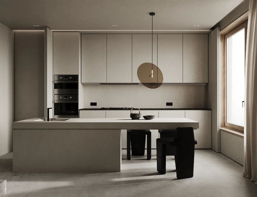 餐廳與廚房連著客廳一起,視野上顯得更加寬敞。無把手設計的柜面將廚房雜亂的一面隱藏起來,達成了空間上一致的簡約美觀。