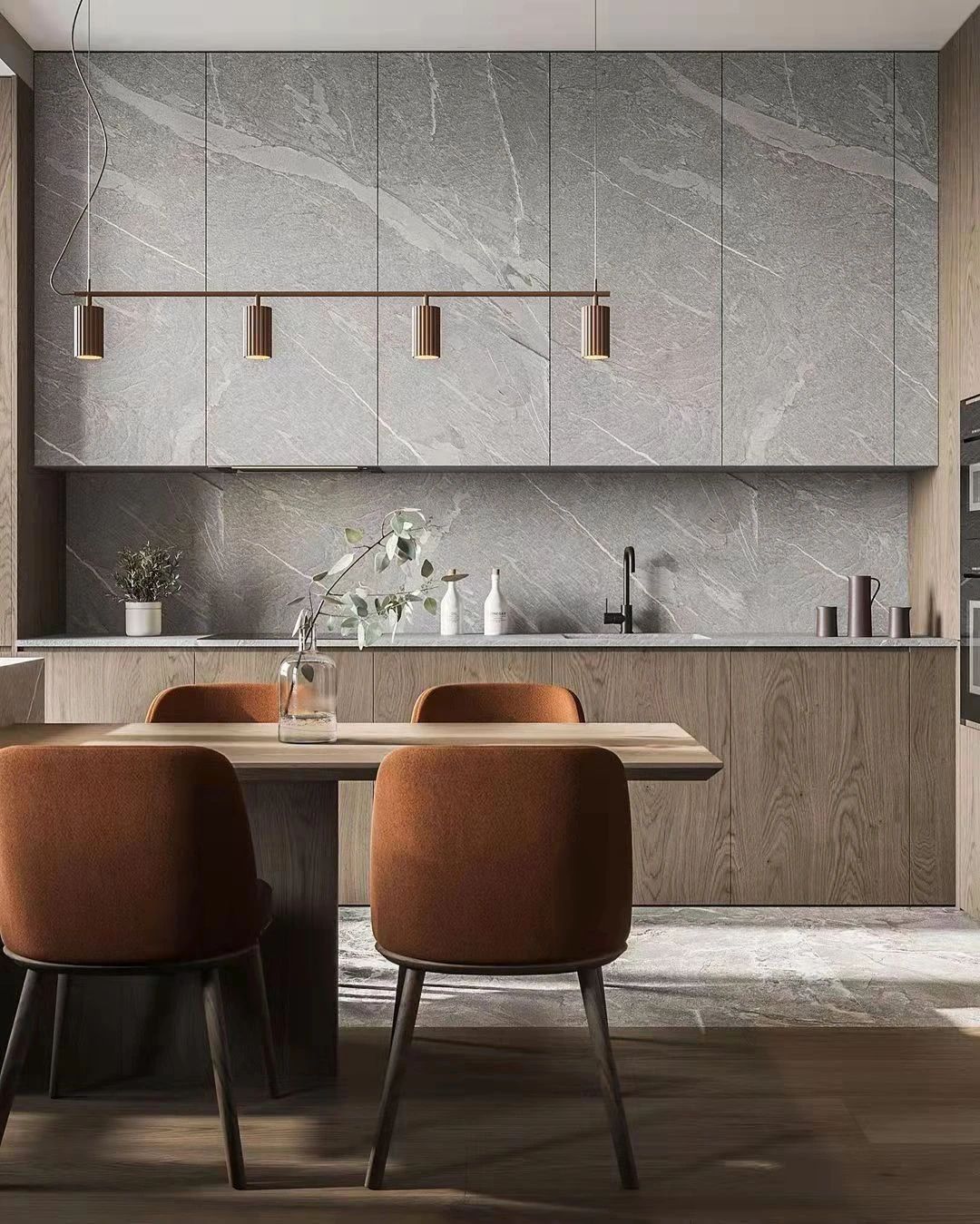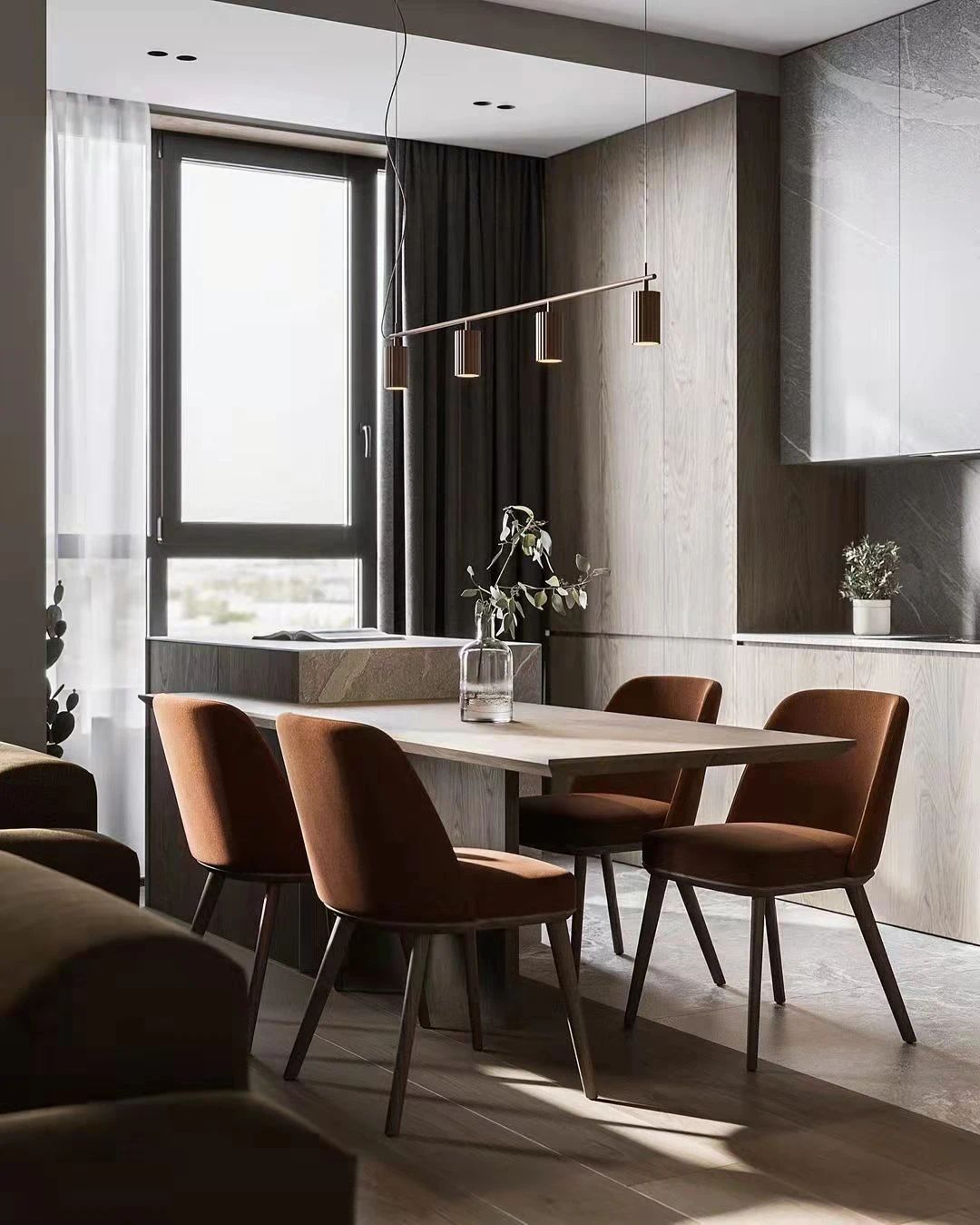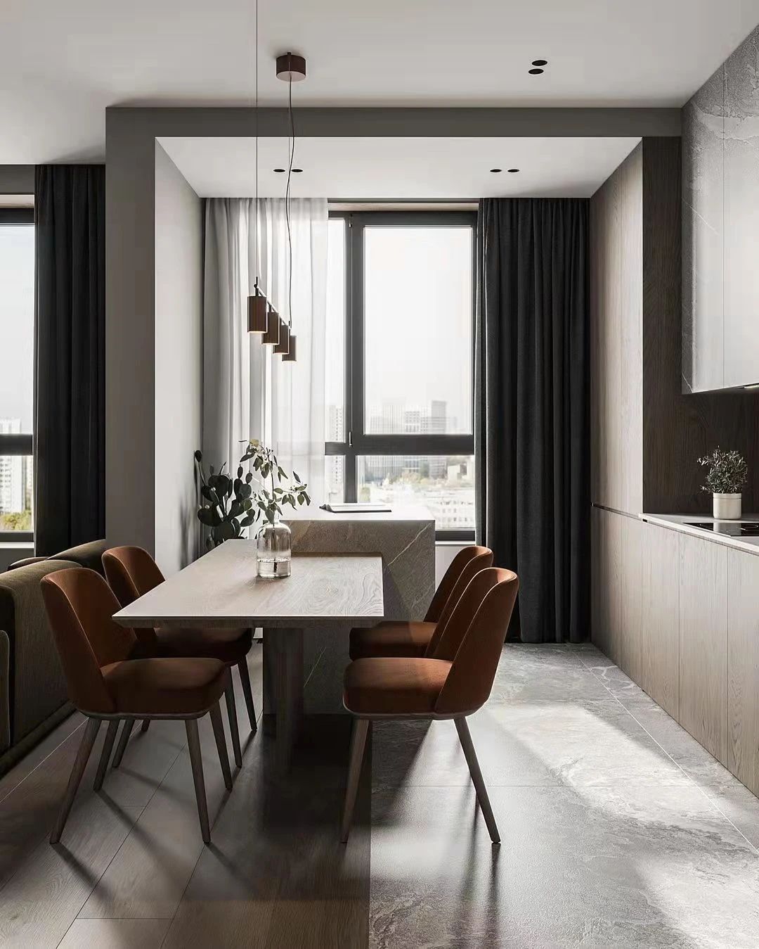 用餐區(qū)通過(guò)半堵墻和沙發(fā)連接而成的視覺(jué)分割線而獨(dú)立,極富美感的選擇了大理石工作臺(tái)面和廚房墻面,既達(dá)成了色彩上的統(tǒng)一,也保證了實(shí)用性。溫暖的橘色座椅搭配桌面上的綠色植物,房間里充滿了生機(jī)。