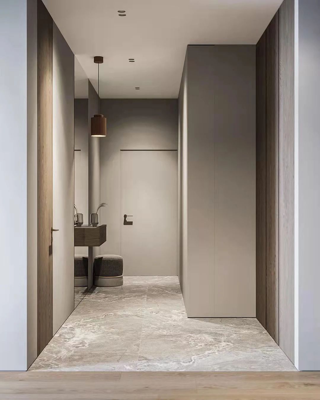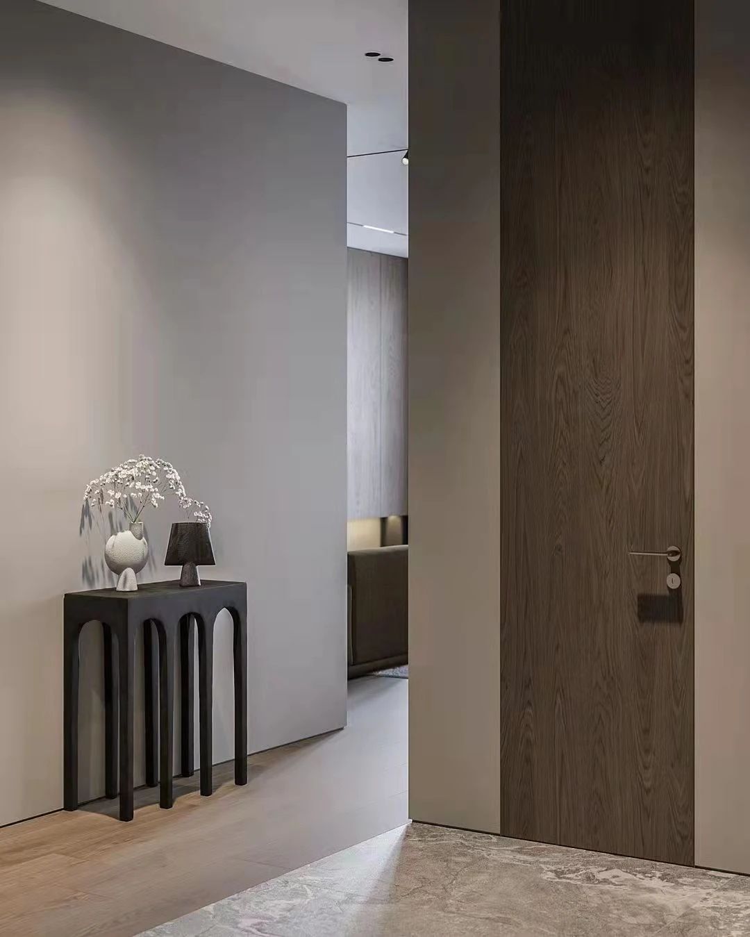 順著餐廳走過(guò)一段走廊即可到達(dá)臥室區(qū),設(shè)計(jì)師通過(guò)墻面與小臺(tái)色彩的對(duì)比,讓這里的擺設(shè)充滿藝術(shù)氣息。