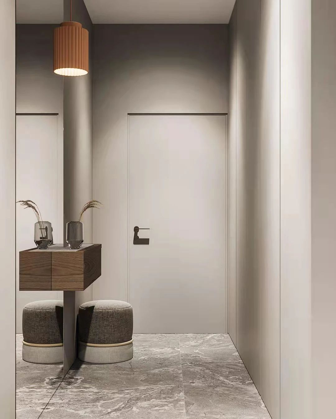 進(jìn)入房間,簡(jiǎn)單的布置也是匠心獨(dú)運(yùn),落地鏡開(kāi)闊空間,橘色的吊燈為歸來(lái)的主人帶來(lái)一絲撫慰。