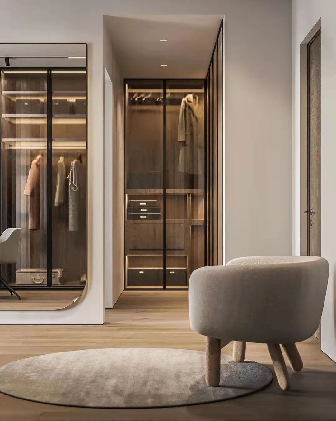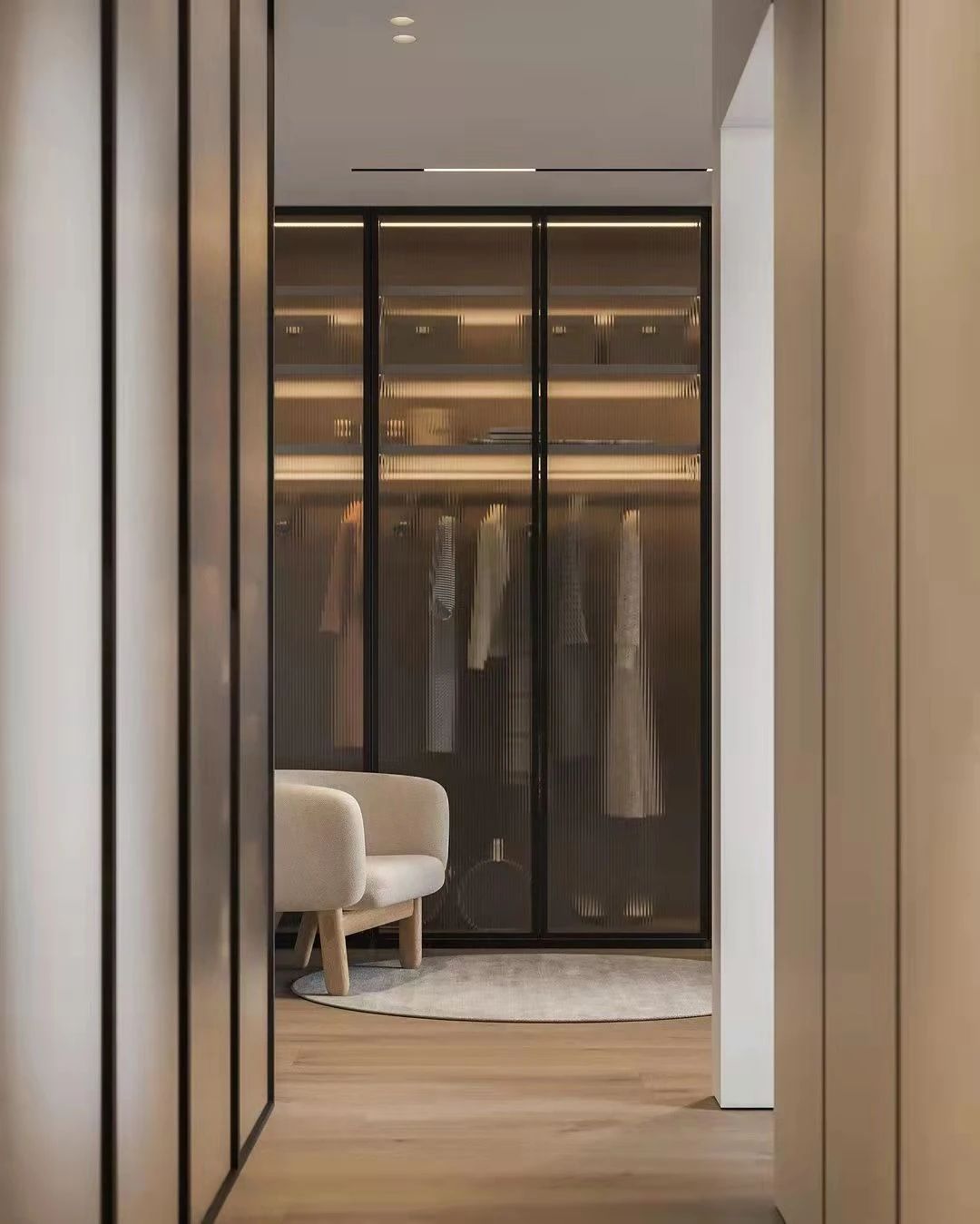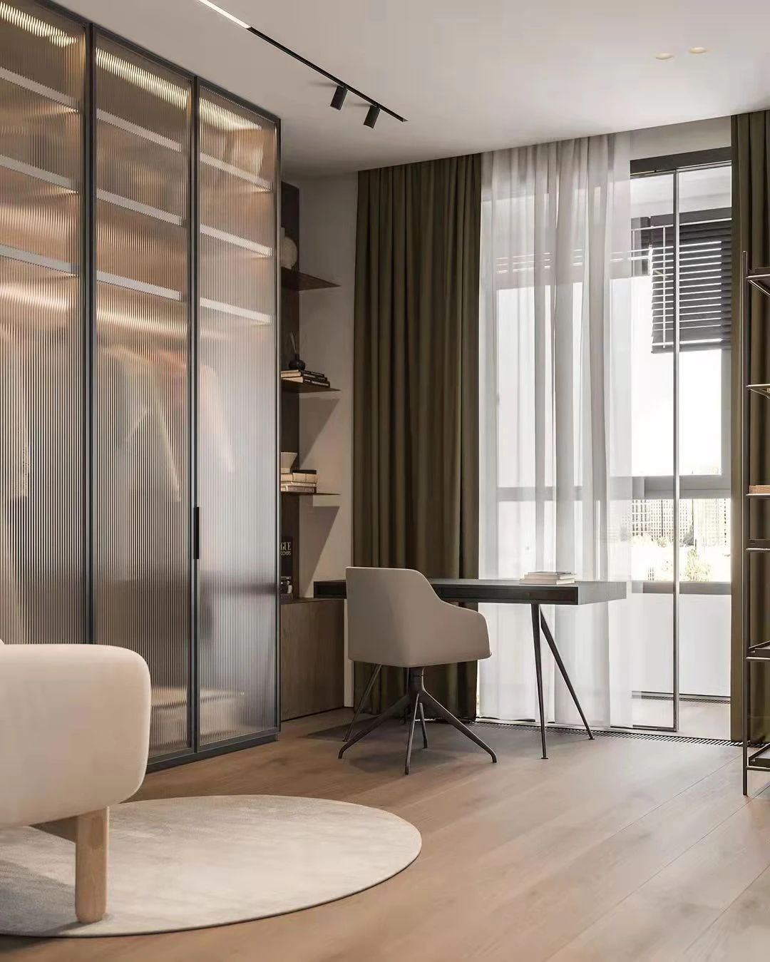 寬敞的衣帽間就在臥室旁側(cè),簡(jiǎn)約風(fēng)格的裝飾,透明的衣柜門提供了良好的視野,顯得格外遼闊。書房也布置在這里,充分利用了空間。同時(shí)這房間里的大片留白,當(dāng)下是如山水畫般的寫意,也能給未來(lái)房間的快速轉(zhuǎn)型做好準(zhǔn)備。