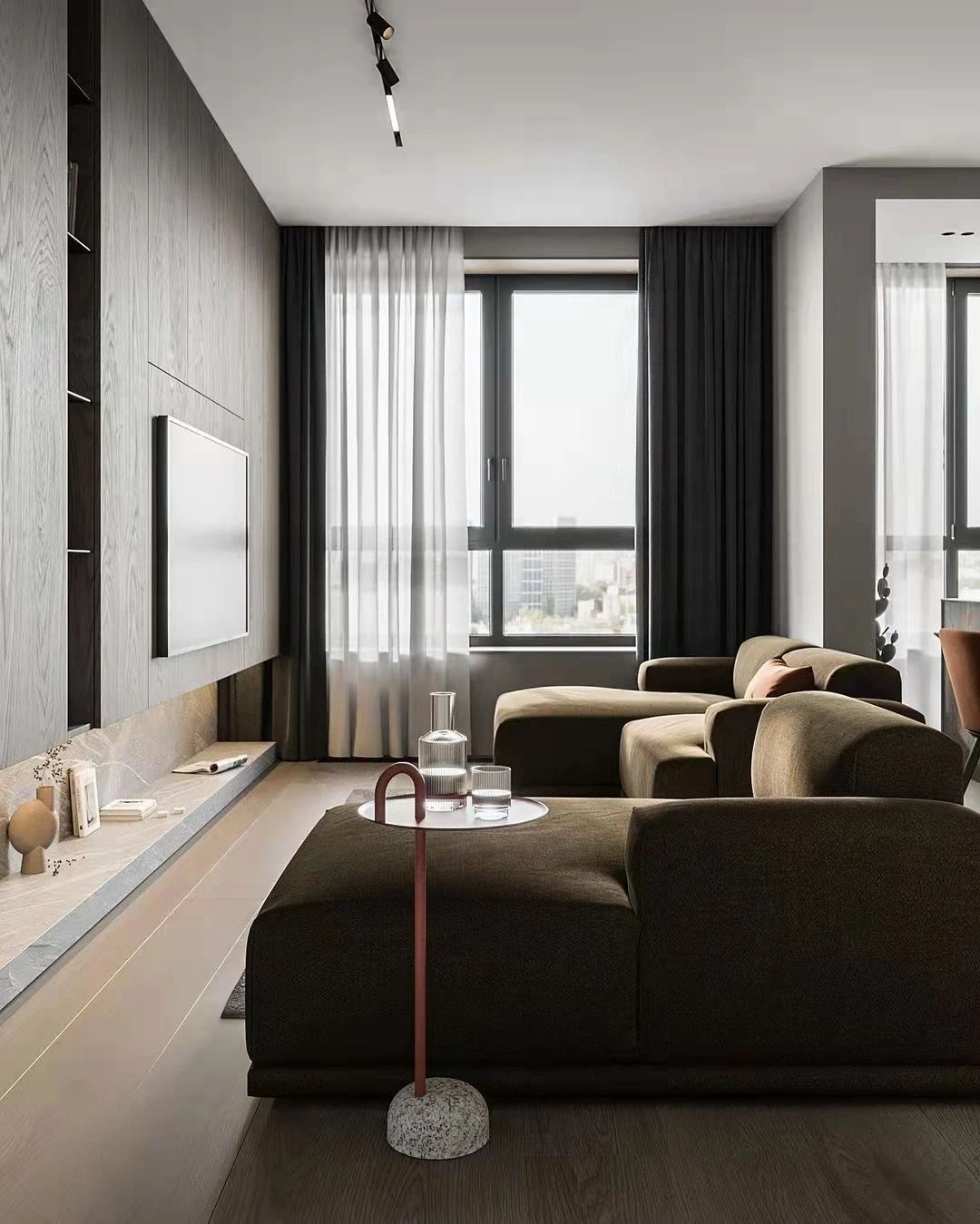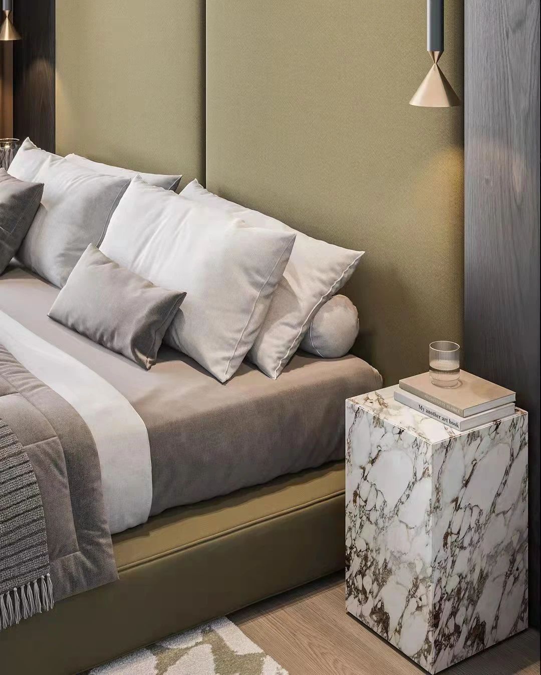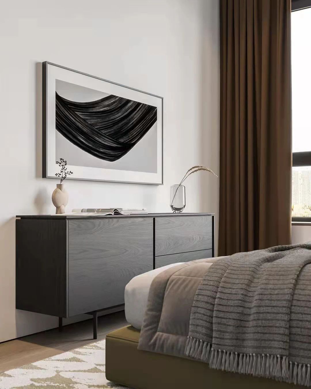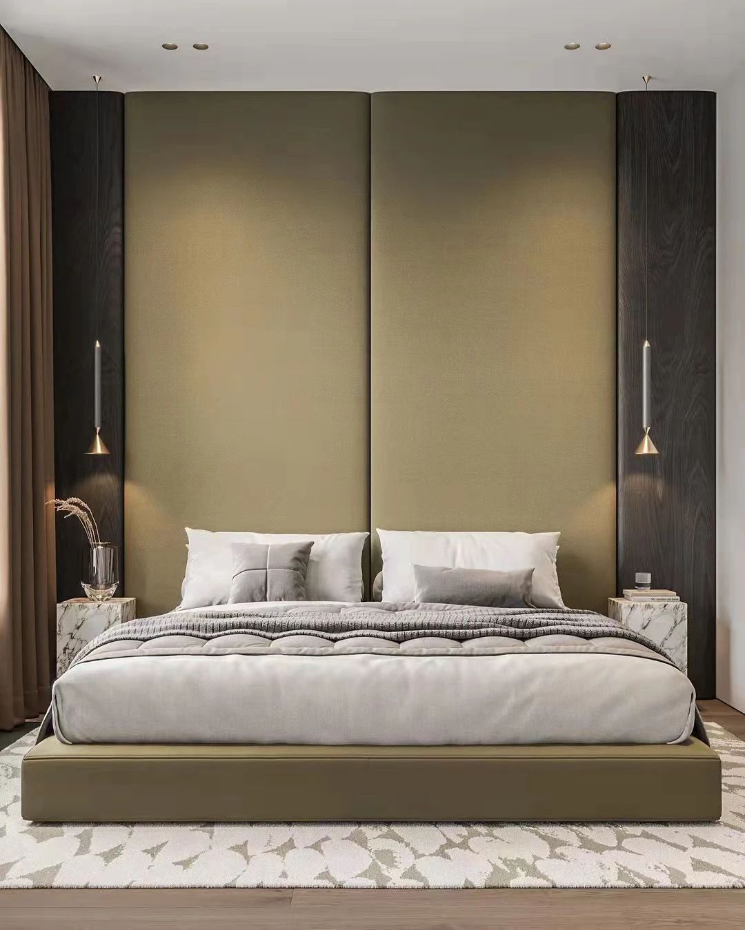 臥室采用了現(xiàn)代極簡(jiǎn)風(fēng)格,大床,高墻。由中間向左右,形成了對(duì)稱的美感。作為休息的房間,設(shè)計(jì)師留給它的空間不大,一床一幾而已。并且無(wú)論是墻壁,地毯亦或是床品,厚重的選擇都帶來(lái)了讓人窩心的溫暖。