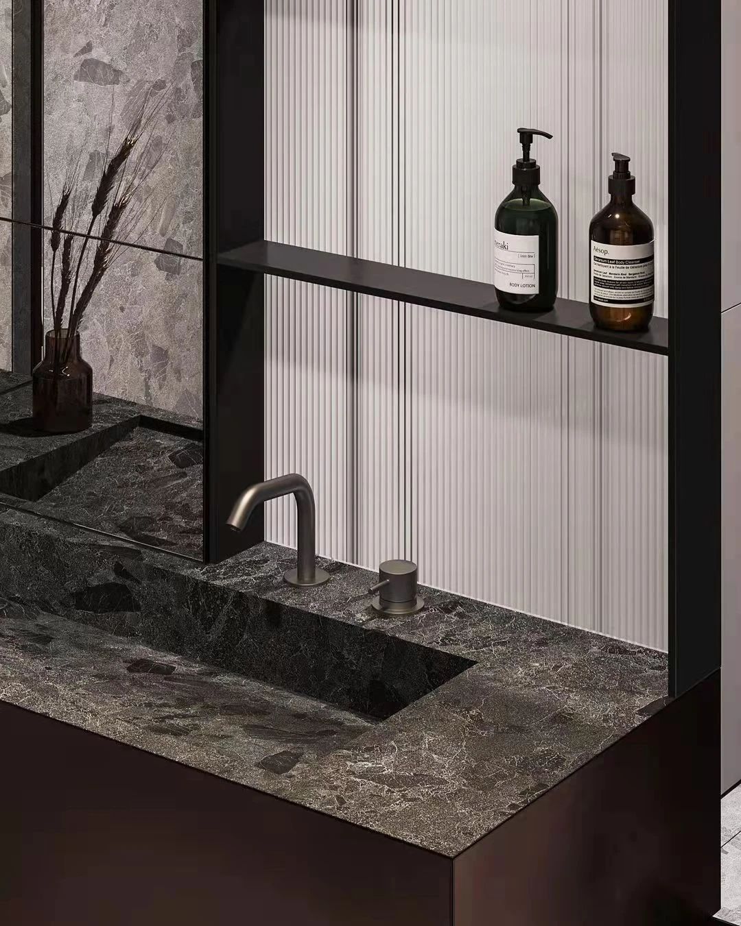 衛(wèi)生間是所有房間之中最為放松的的場(chǎng)所,因此設(shè)計(jì)師為主人留下了充足的自由。色彩搭配簡(jiǎn)約明了,略帶昏暗的燈光,搖曳的水滴,這里是衛(wèi)生間,盡情舒展。
