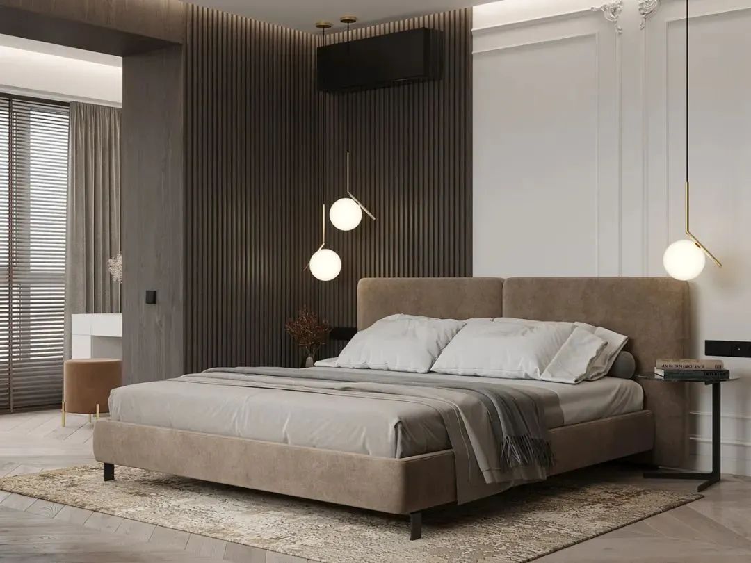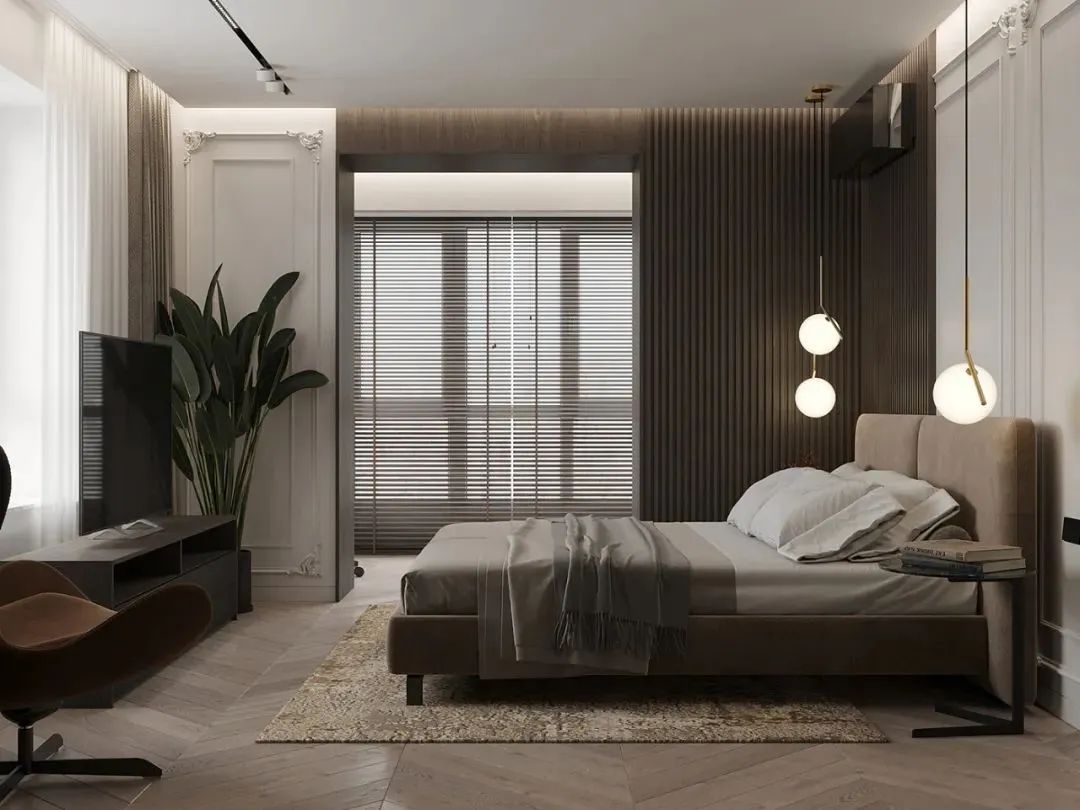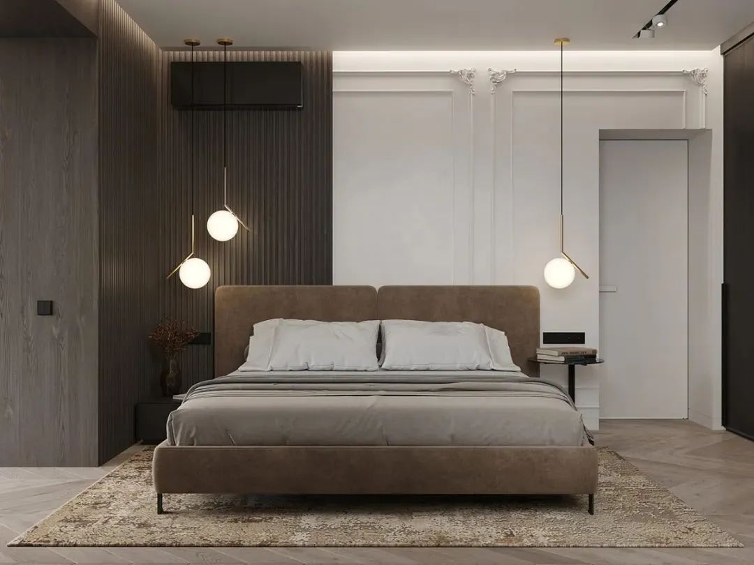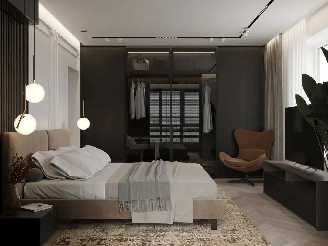 臥室的整體色調偏暗,為屋主打造了一個舒適的休憩空間。灰棕色的床架搭配上暖灰色的床品,為整個空間打下沉穩的基調。床頭燈富有設計感,金屬材質的加入提升了整體空間的質感,十分精致奢華。落地窗前是舒適的貴妃椅,能夠讓屋主度過愜意的下午茶時光。