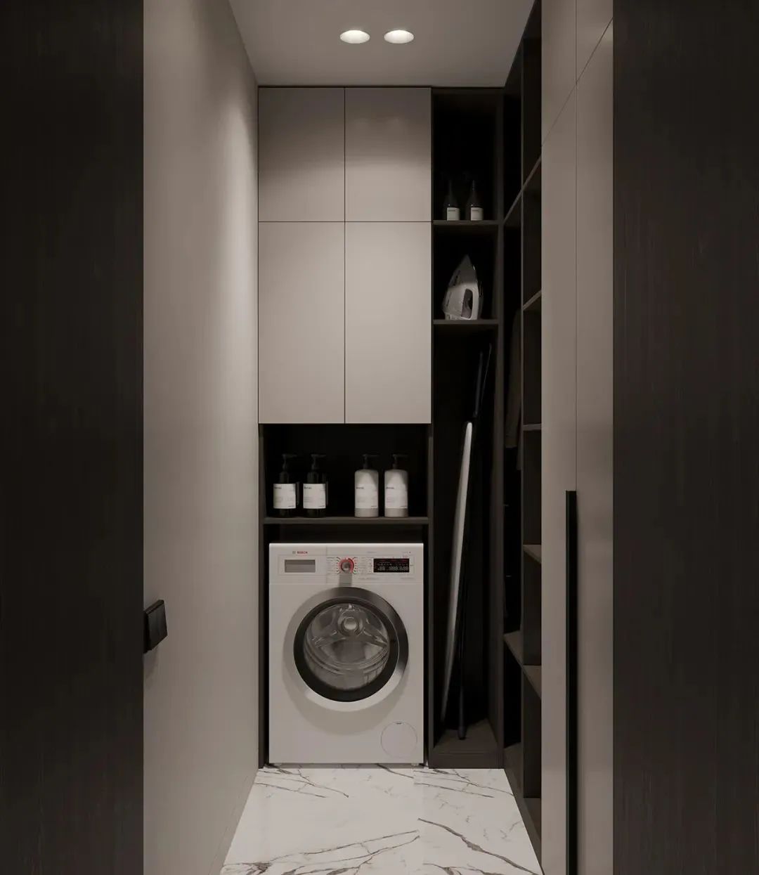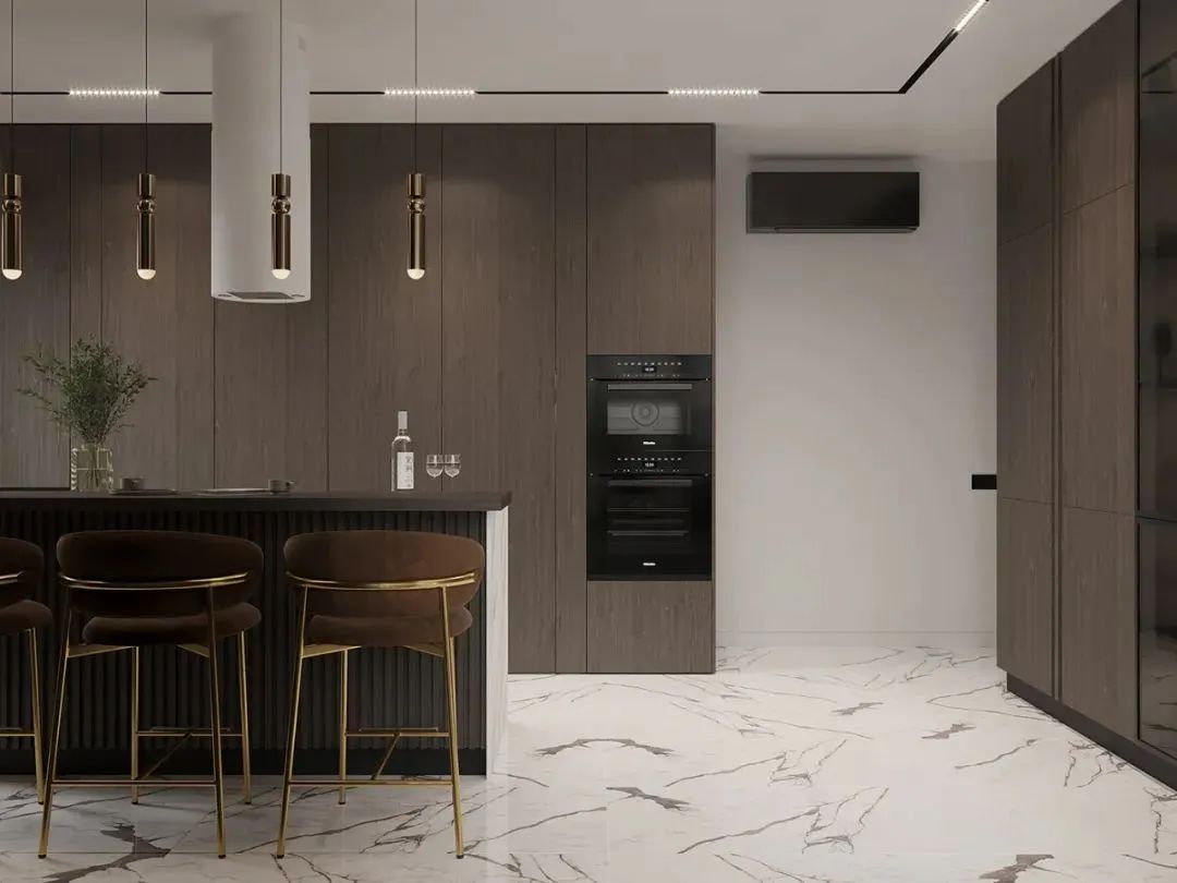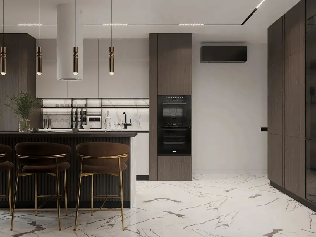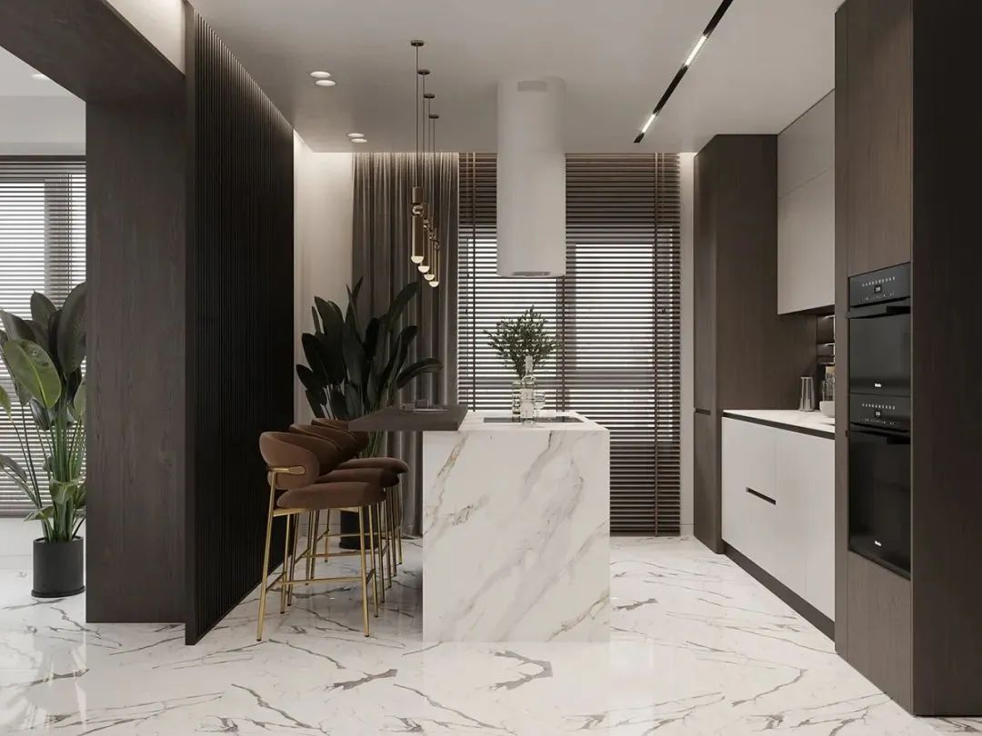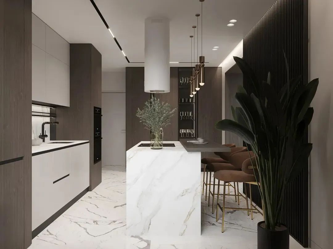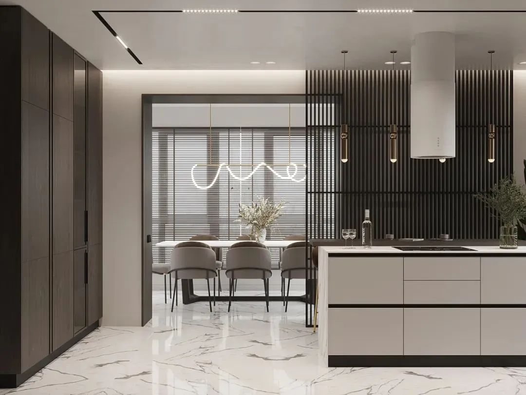 餐廳與廚房選用了半開放式的設計,白色的大理石地面搭配上相同材質的中島臺,營造出具有一體性的空間。簡潔的色調給人干凈純粹的視覺感受,餐桌上方富有線條感的吊燈十分高級大氣。廚房電器內置于櫥柜當中,兼具美觀性與實用性。