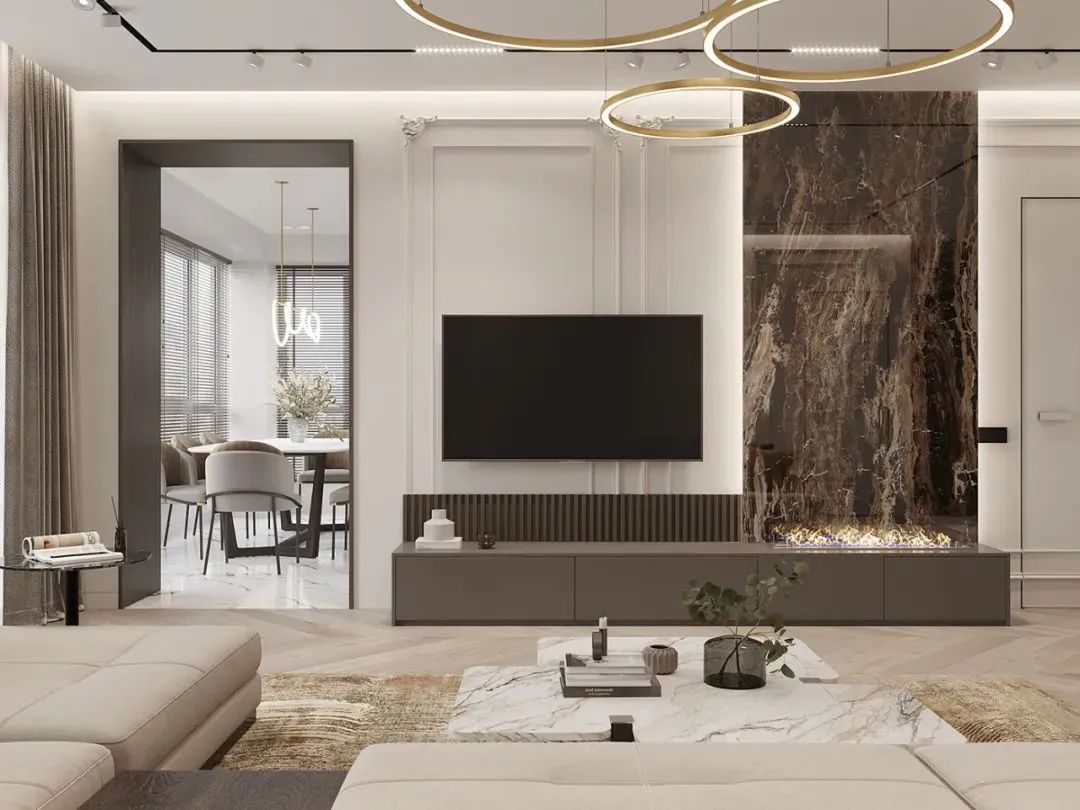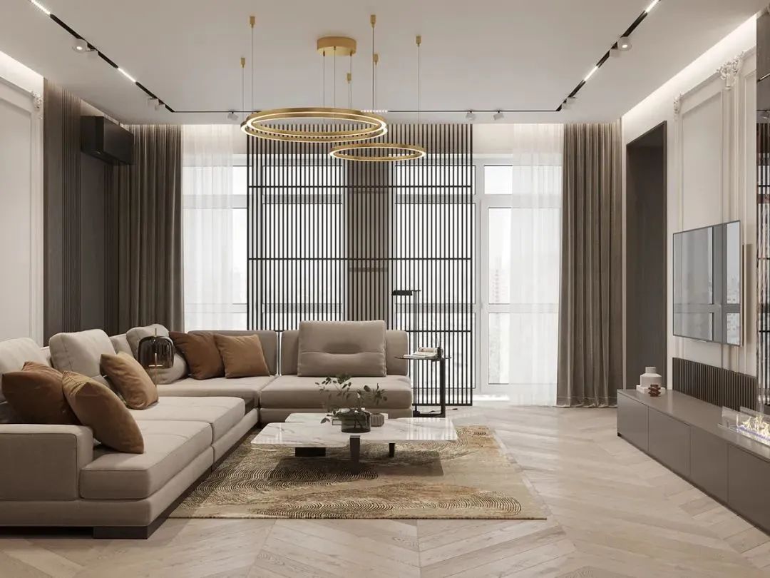 客廳中,設計師選用暖色作為空間的主色調,營造溫馨輕奢的空間氛圍。L型的布藝沙發搭配上造型簡潔的白色大理石茶幾,展現出現代極簡主義下的幾何美感。茶幾上的裝飾植物為這片暖調空間增添了一抹色彩。圓形的金屬吊燈讓空間更加柔和。