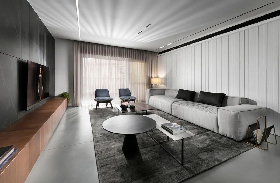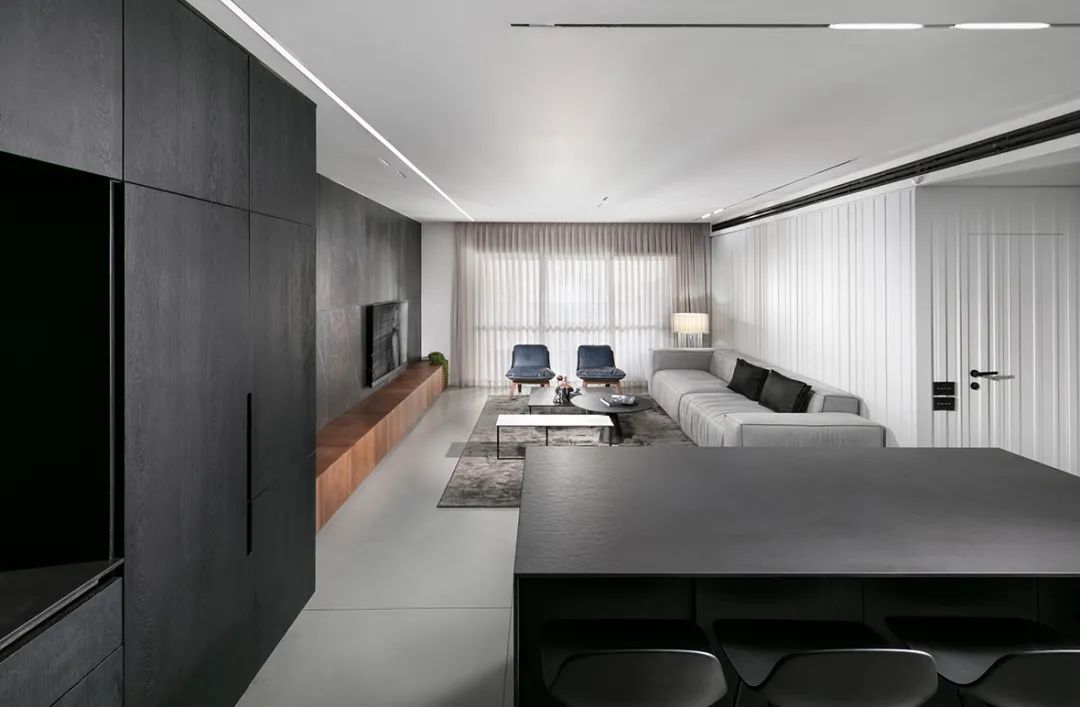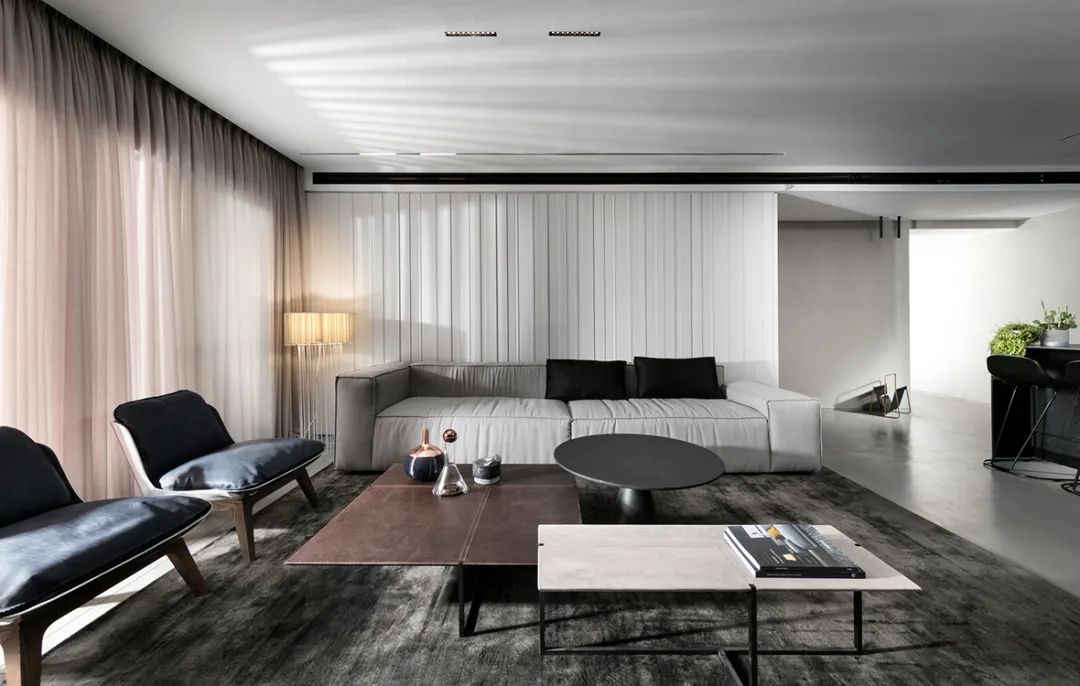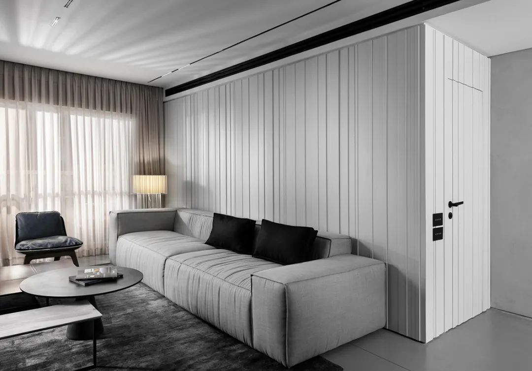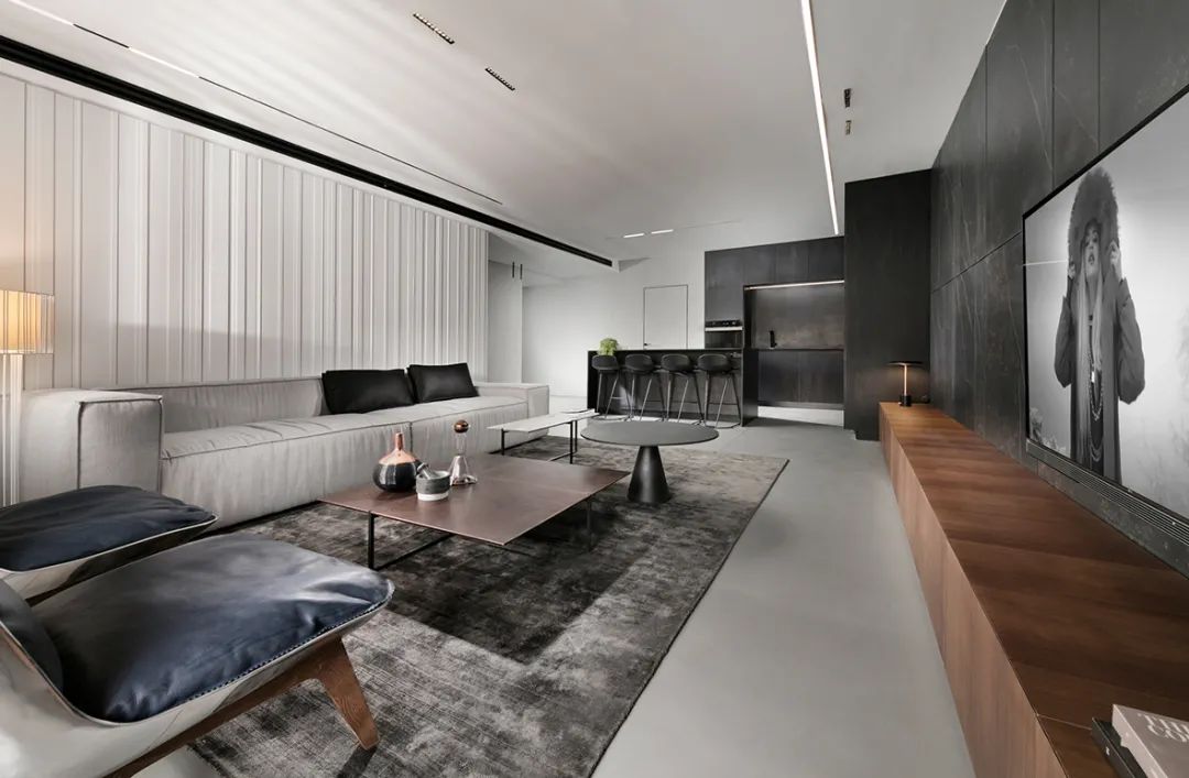 公寓的整體依舊是采用高級(jí)灰配色,低飽和度的色彩搭配營(yíng)造了一種高壓絢爛的空間氣質(zhì),簡(jiǎn)單的配色貫穿于空間中,使得空間的整體性更強(qiáng)。