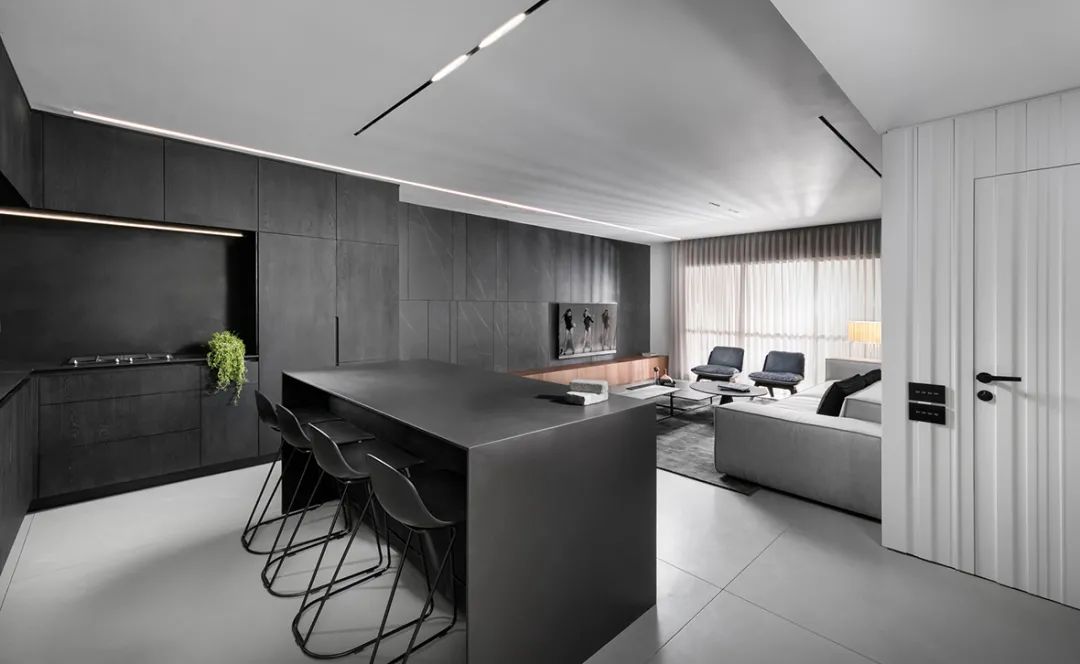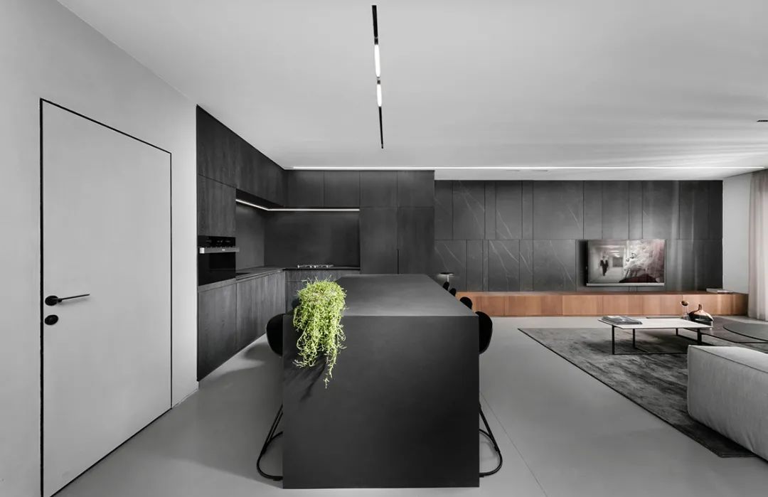 廚房依舊是延續(xù)簡(jiǎn)約的設(shè)計(jì),黑與白的色彩拼接,利落的線條搭配上精致的家具,奠定了高度理性的空間基調(diào),啞光黑色的大面積使用沉穩(wěn)而高級(jí)。綠色植物的放置為這片灰白色的空間增添了一抹色彩,展現(xiàn)了極簡(jiǎn)主義下的生活美學(xué)。