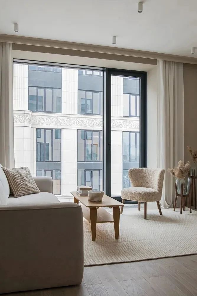 盡管面積有限,但設計師在每個區域都精心構思,旨在創造一個溫馨、舒適的室內環境,以滿足年輕女主人的愿望。整套住宅的主要設計理念圍繞著溫暖和自然元素展開。淺米色是主要的色調,搭配溫暖的木質元素,使整個室內充滿了自然的細致內飾。黑色細節的巧妙使用增加了空間的層次感,使其更加豐富。