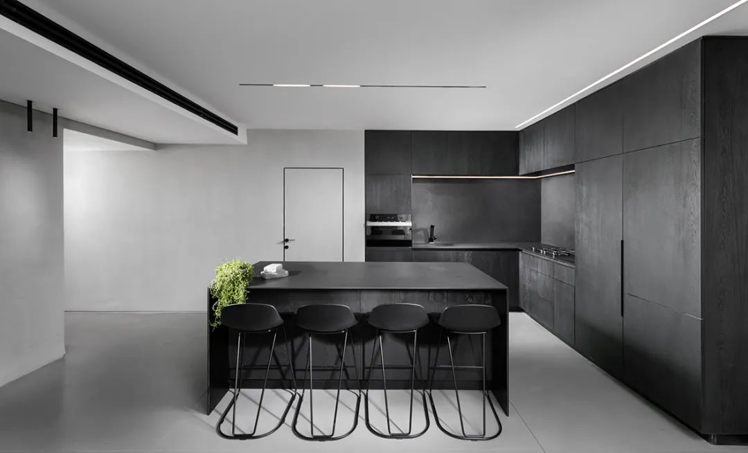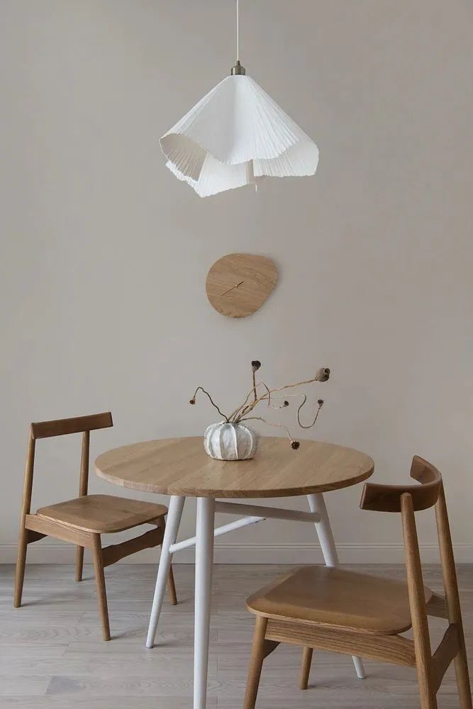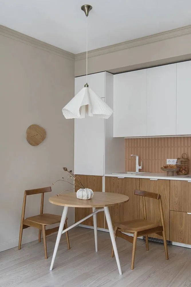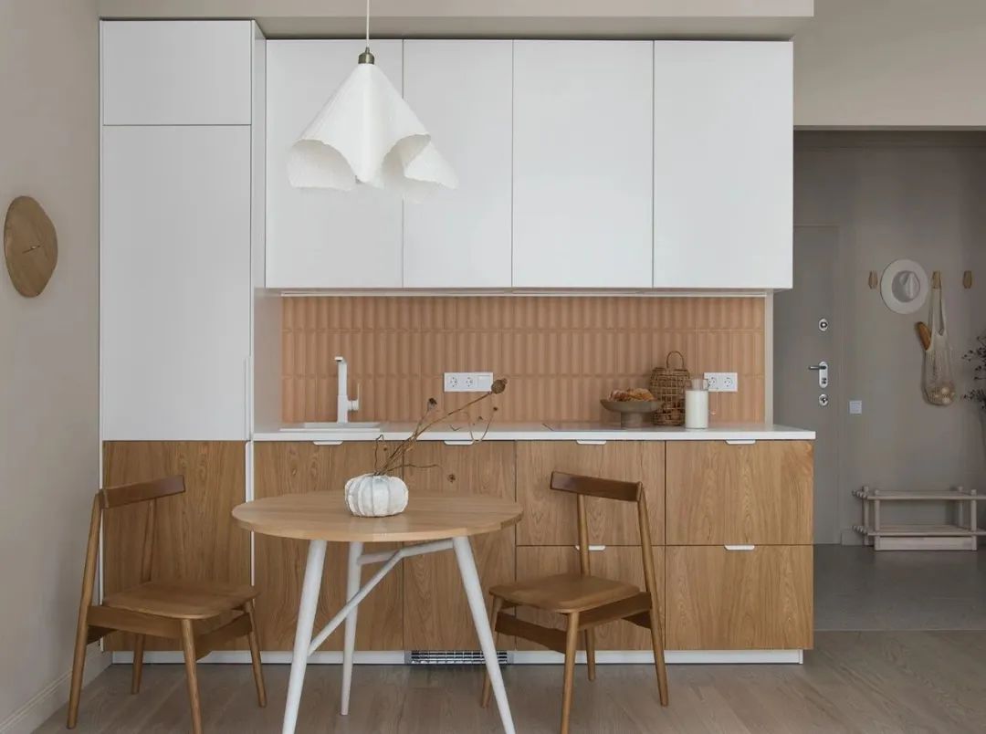 餐廳和廚房位于客廳的旁邊,采用了開放式設計,充分利用有限的公共空間。主要的設計色調是原木色和白色,營造出溫馨的氛圍。原木材質的精細紋理豐富了空間的細節,使整體更顯精致。圓形的小餐桌搭配原木餐椅,不僅美觀而且實用,為業主提供了宜人的用餐場所。