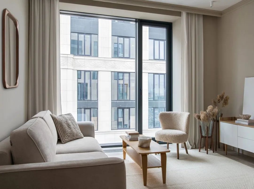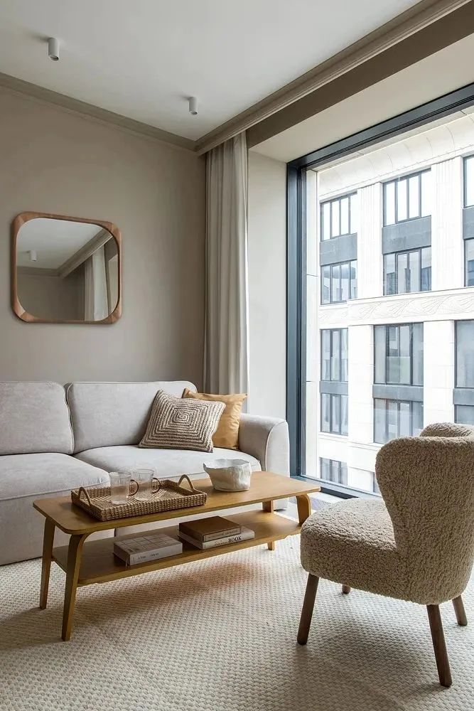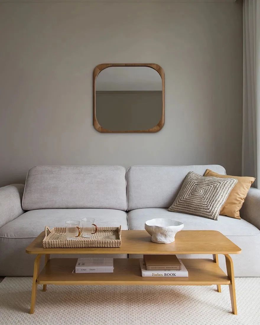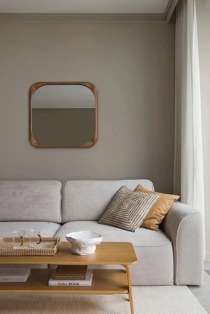 客廳是這套住宅的核心,以溫馨舒適為設計理念。淺灰色的布藝沙發搭配簡潔的木質茶幾和藤編地毯,創造了一個自然舒適的會客空間。沙發上的暖黃色抱枕增添了空間的色彩層次。大面的落地窗充分利用了自然光線,讓整體空間更加通透明亮。墻上的鏡子豐富了層次感,使客廳更加引人注目。