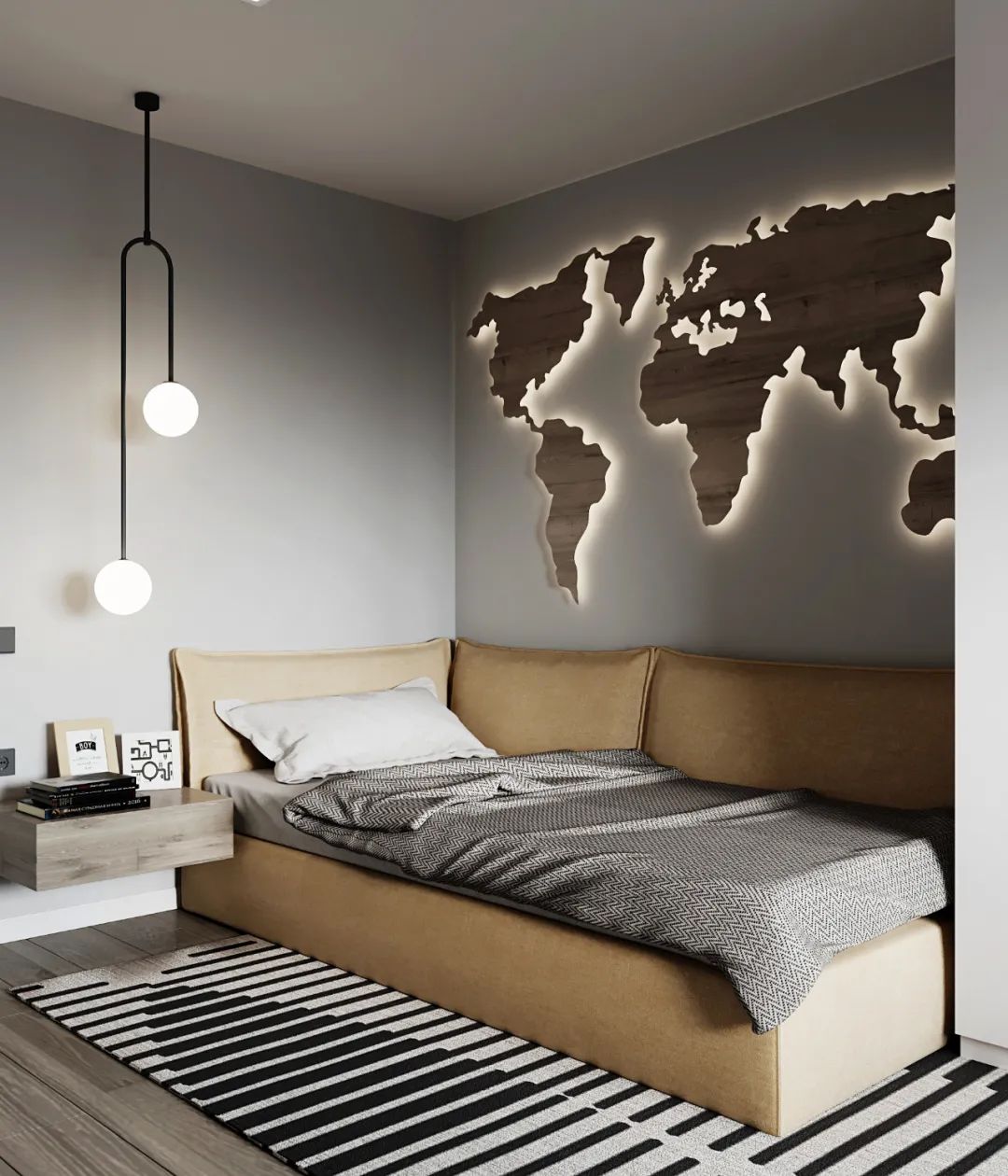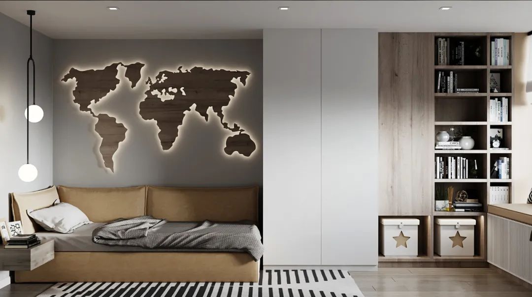 兒童房遵循業主的要求,選用靈活式的教學方式,將世界地圖安放在墻壁上,互動形式的底圖更能增加孩子的學習興趣。