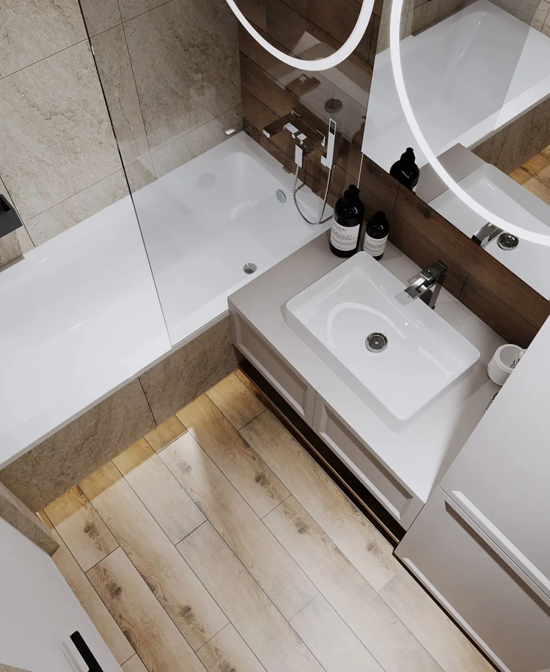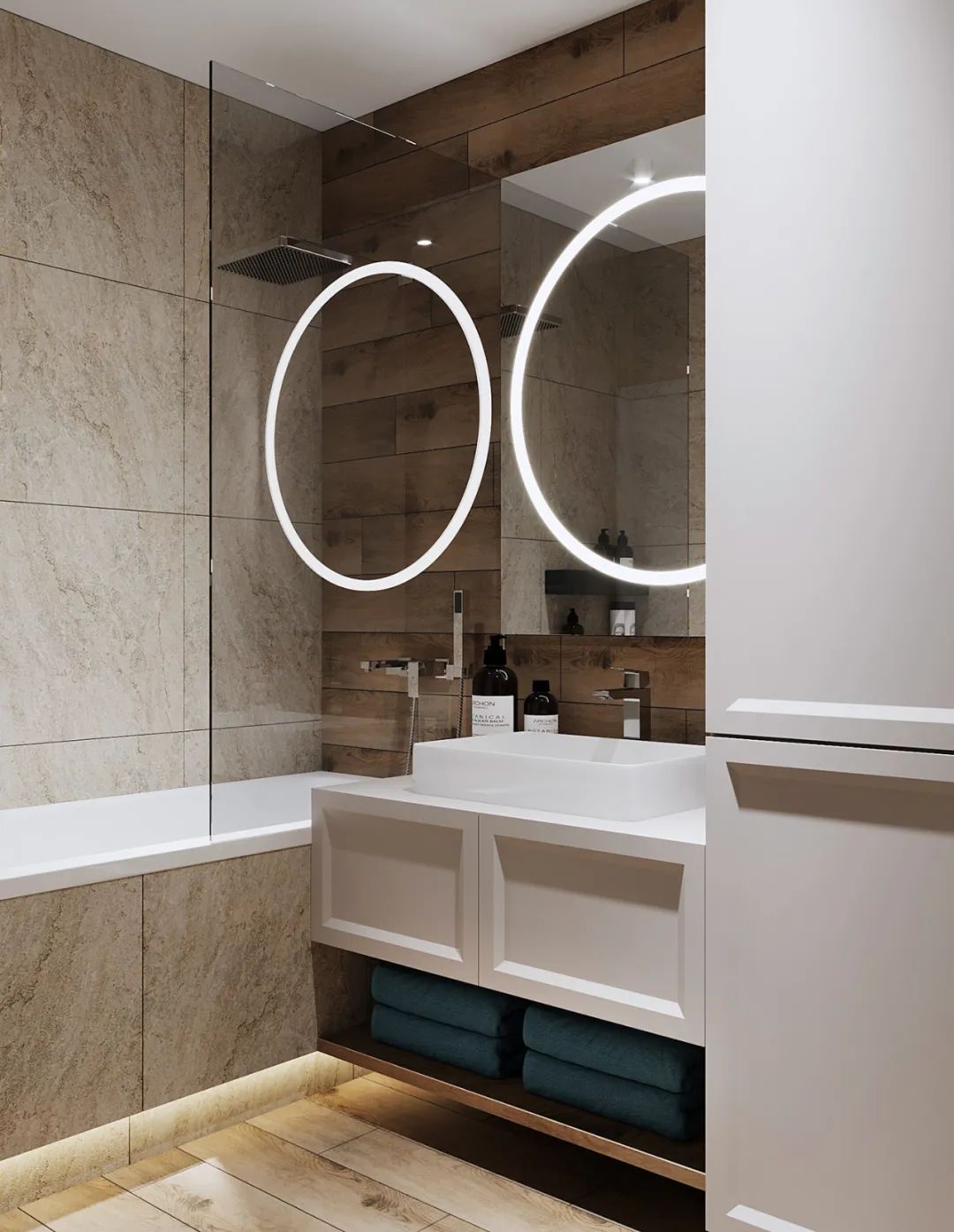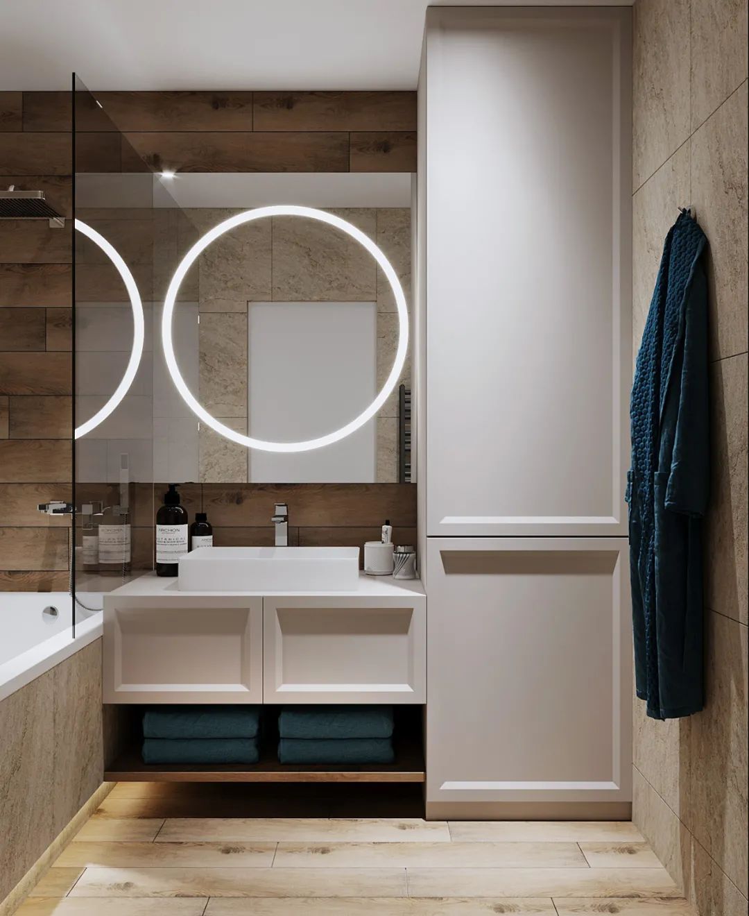 浴室的化妝鏡讓人眼前一亮,圓形的燈架不僅作為裝飾用,更能讓女主人在化妝的時候作為良好的打光板。