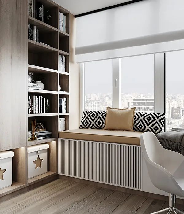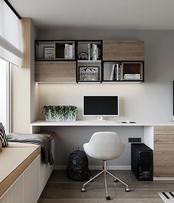 書桌區域非常具有實用感,窗臺改造成飄窗區域,更是一個可以休息看書的好地方。