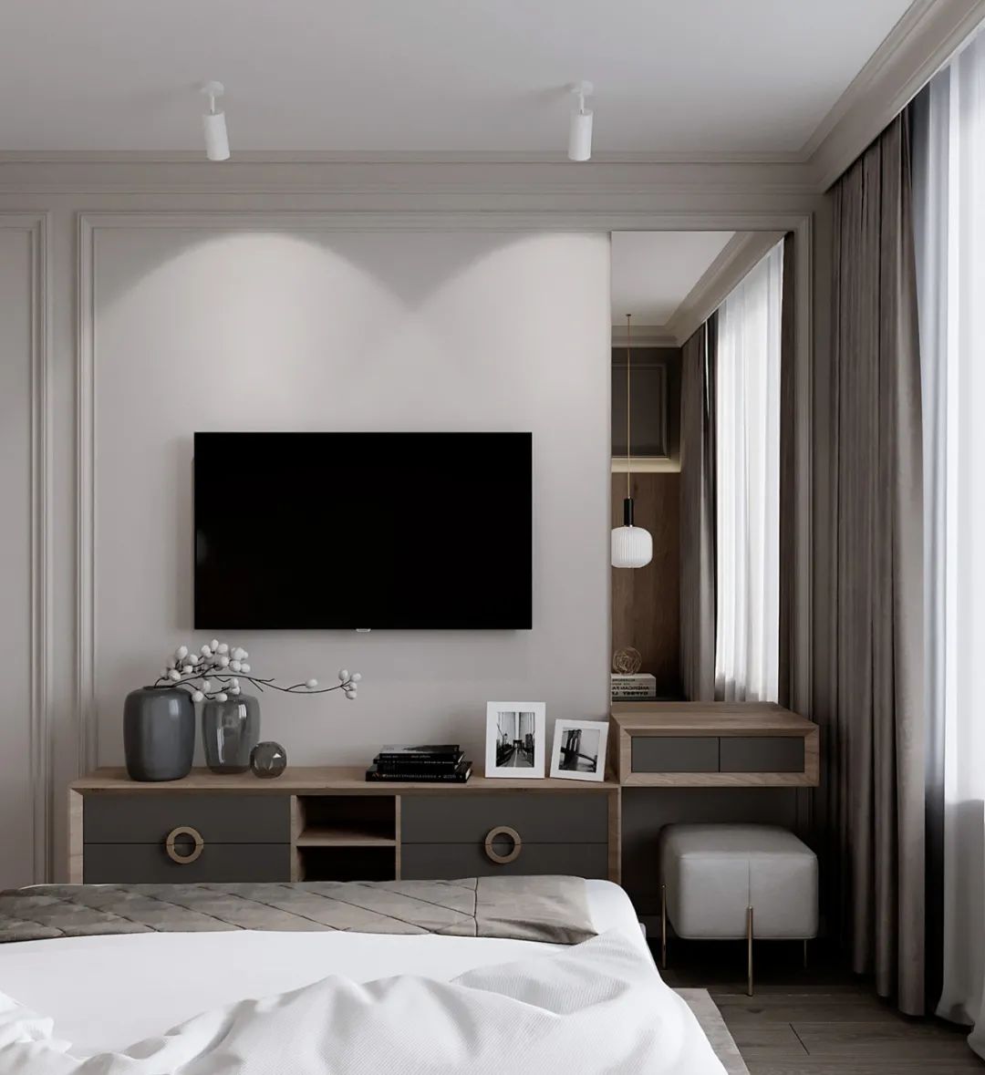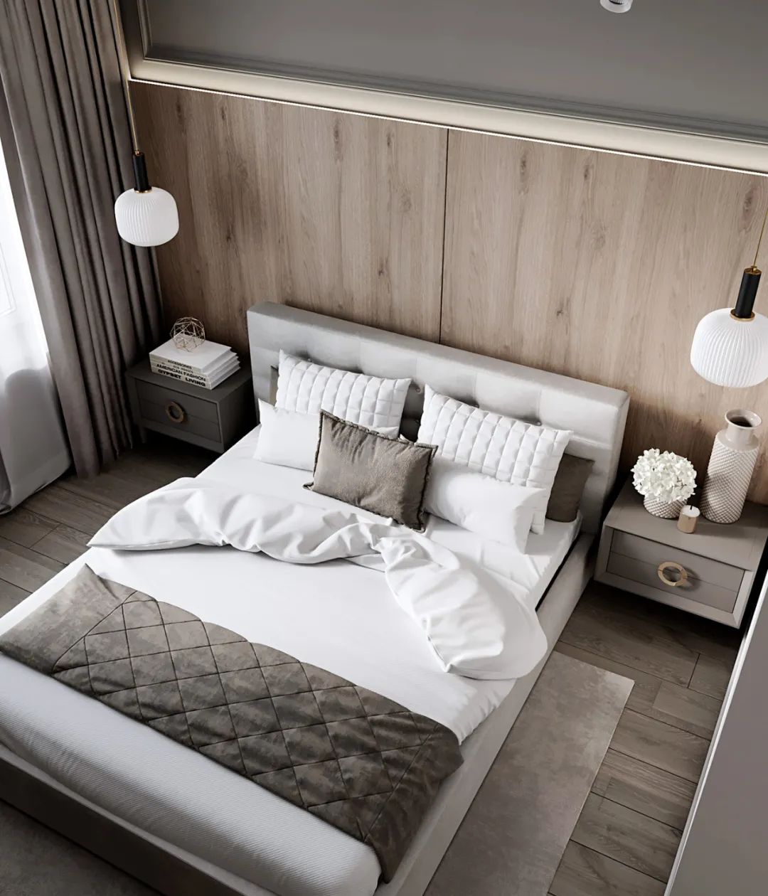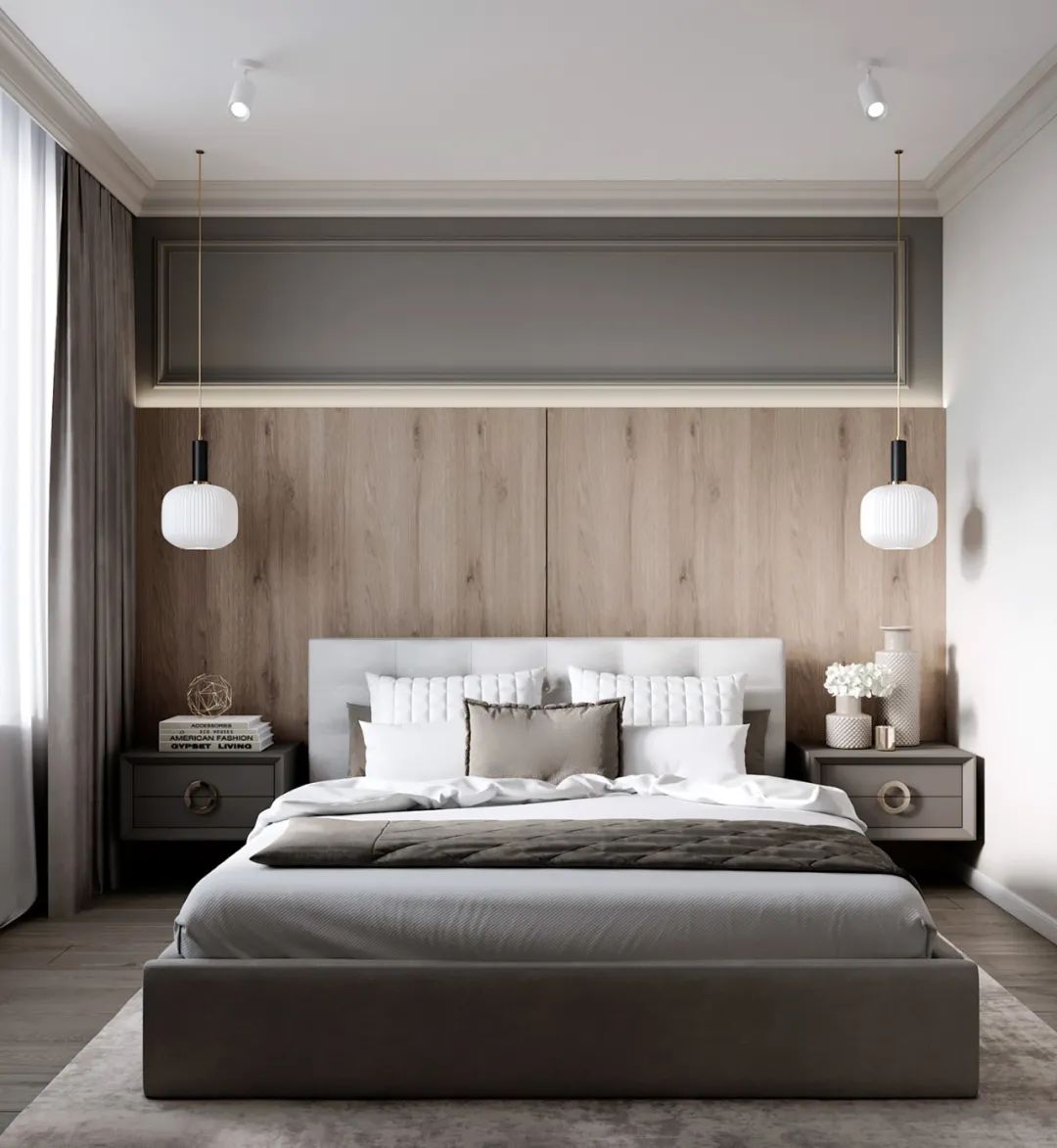 臥室內的軟裝則選用淺灰色和原木色系,自然光照射進來的同時,也讓室內顯得明亮愜意。