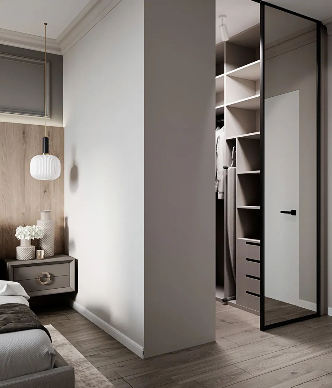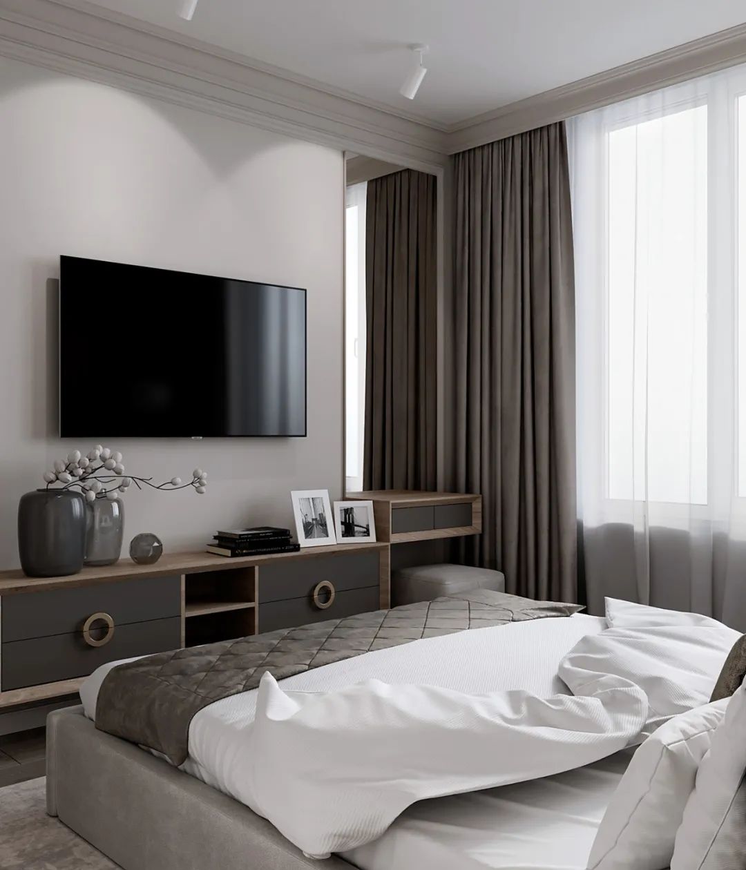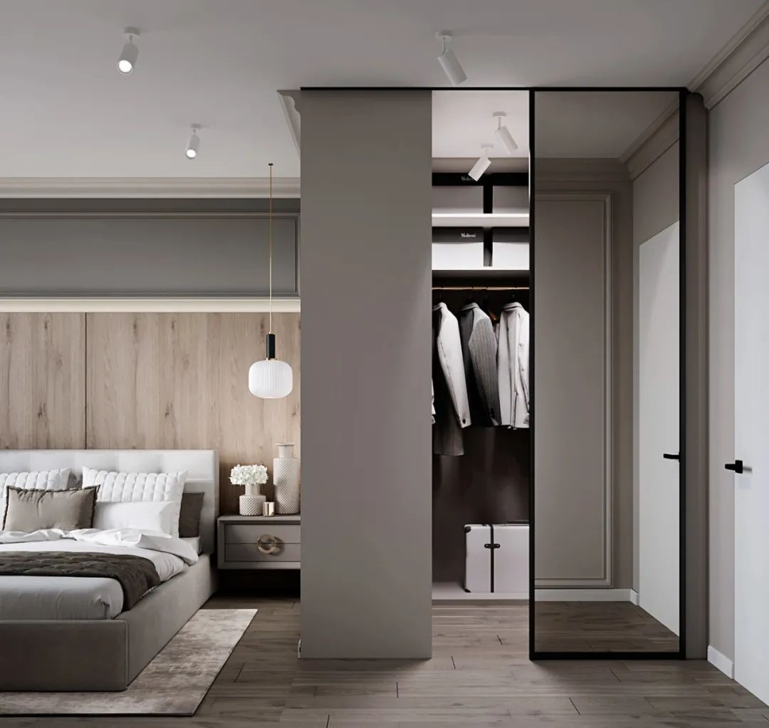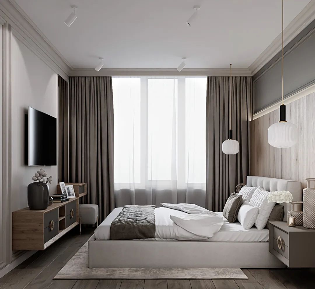臥室內的軟裝則選用淺灰色和原木色系,自然光照射進來的同時,也讓室內顯得明亮愜意。